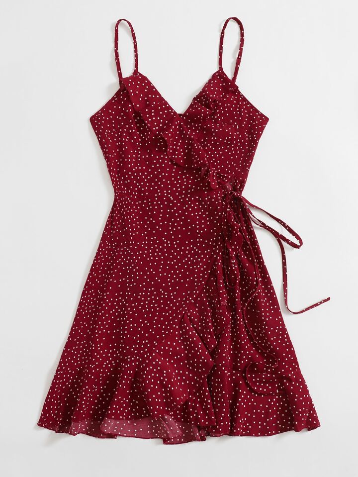 Polka Dot Knot Side Ruffle Trim Wrap Cami Dress,Polka Dot Dress