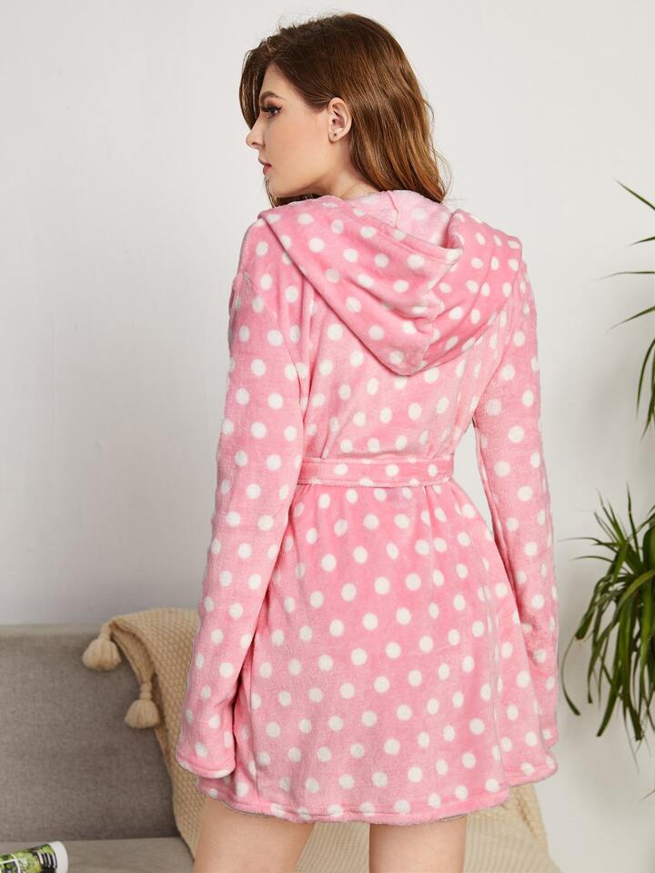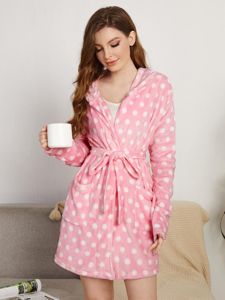 Polka Dot Print Pocket Patched Hooded Belted Flannel Night Robe