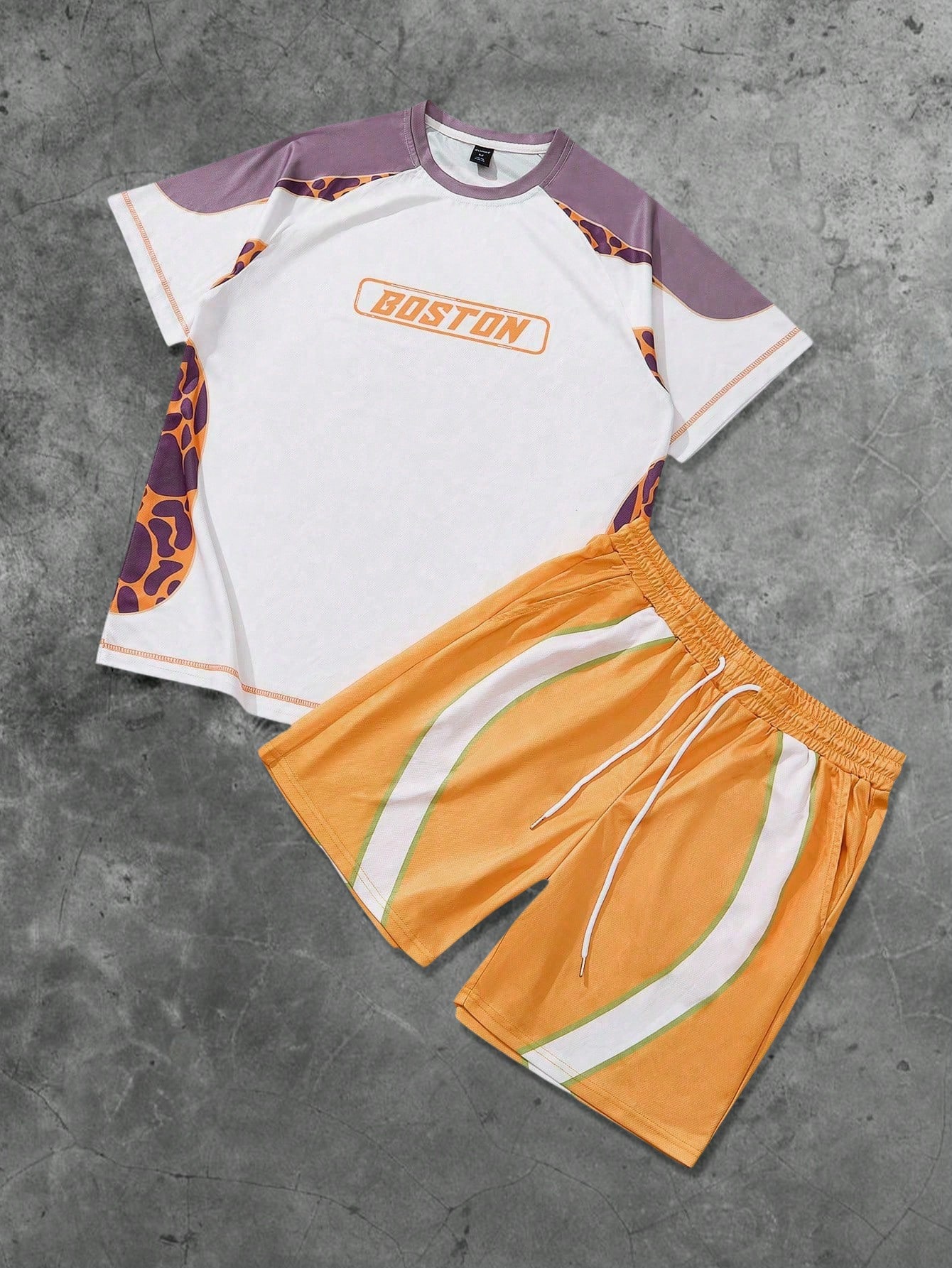 Prep Leopard Print Color Block T-Shirt Set, Street Style Sports Outfit