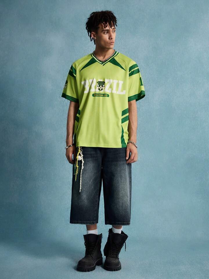 Prep Men's Brazilian Football Short Sleeve T-Shirt, Bestselling Green Football Street & Casual Textured Badge English Contrast Color Splicing Short Sleeve Brazilian Football T-Shirt.