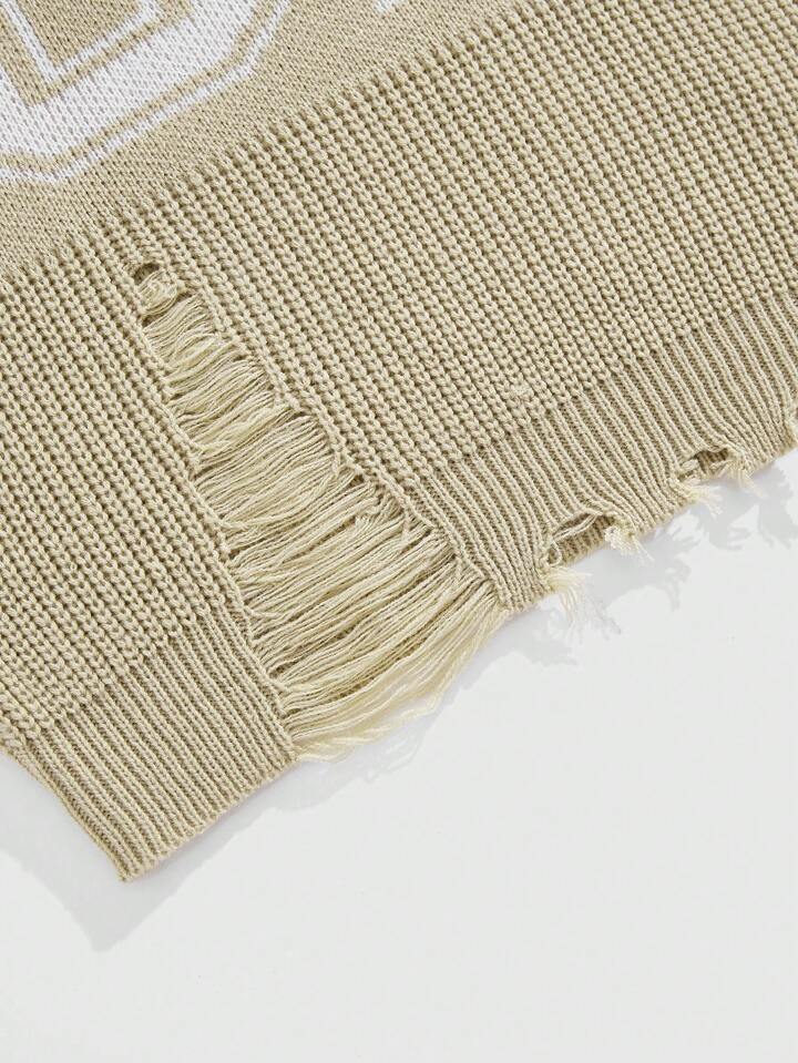 Prep Men's Crew Neck Distressed Digital Jacquard Knit Pullover Sweater, Casual Streetwear