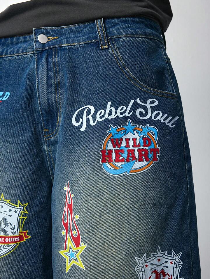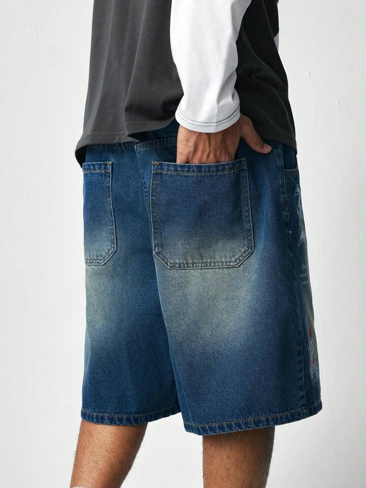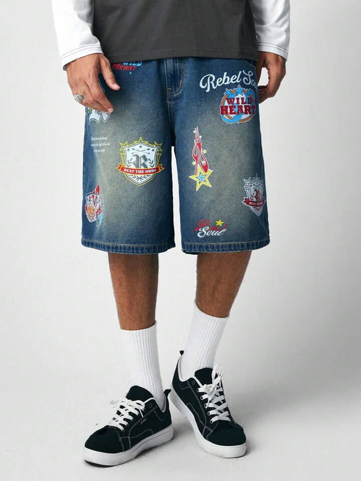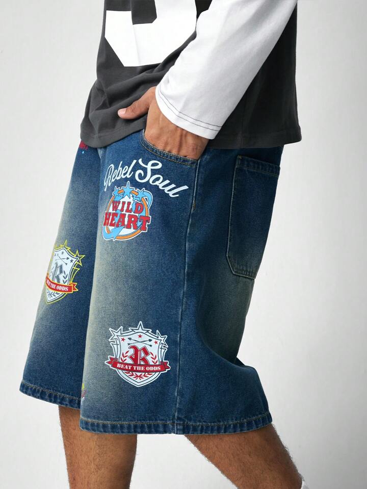 Prep Men's Jersey Badge Letter Print Pocketed Loose Casual Denim Shorts