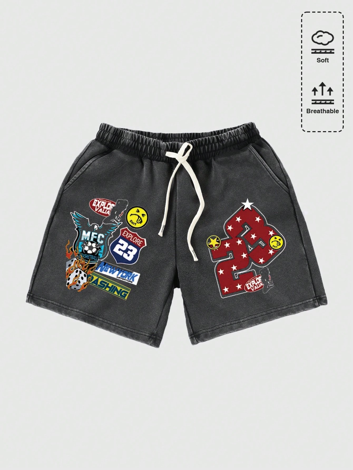 Prep Men's Jersey Vintage Washed Printed Shorts, Street Style