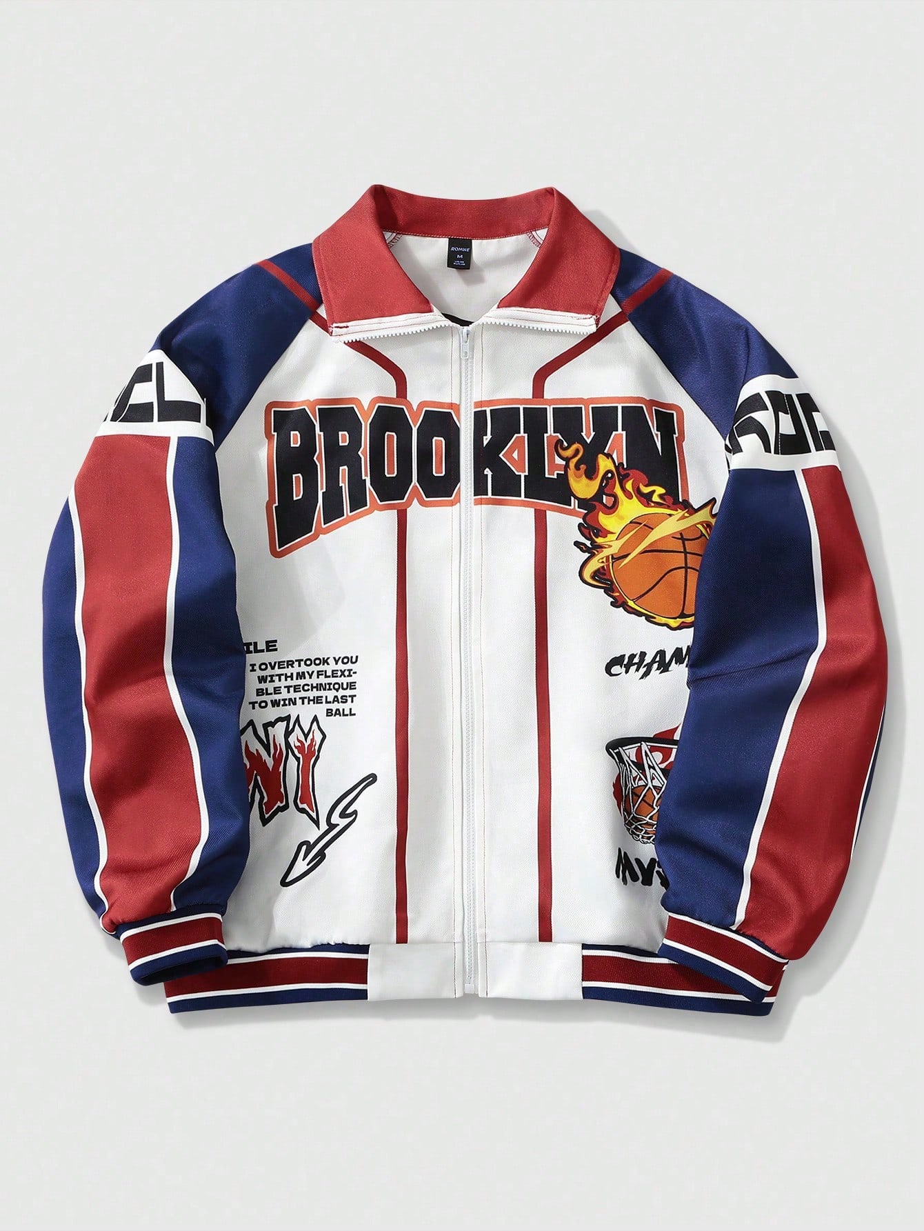 Prep Men's Long Sleeve Basketball Casual Color-Blocking Letter Print Zip-Up Rave Jacket, Autumn