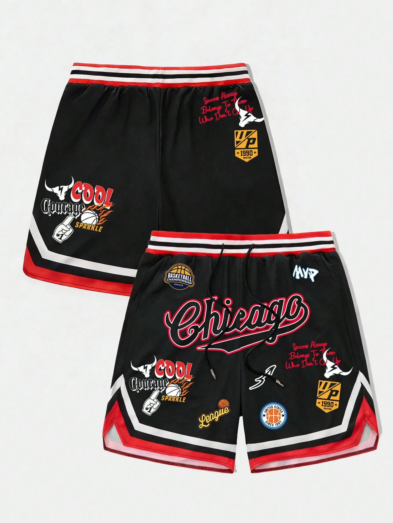Prep Men's Summer Casual Sports Shorts With Contrast Trim Letter Pattern And Drawstring Waist
