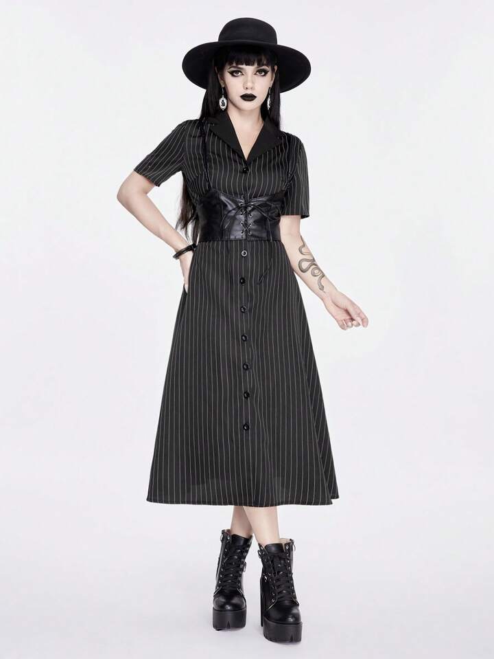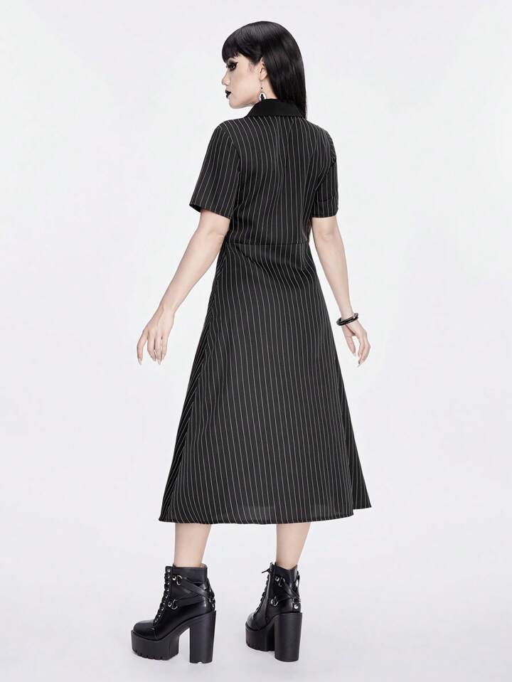 Professional Gothic Style V-Neck Striped Women's Shirt Dress With Lapel Collar