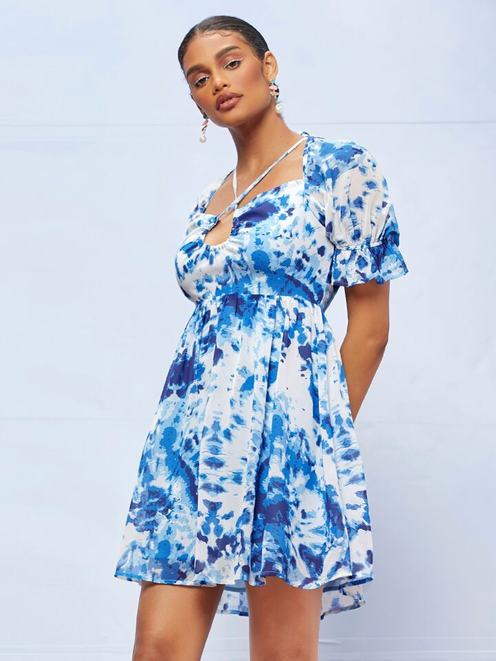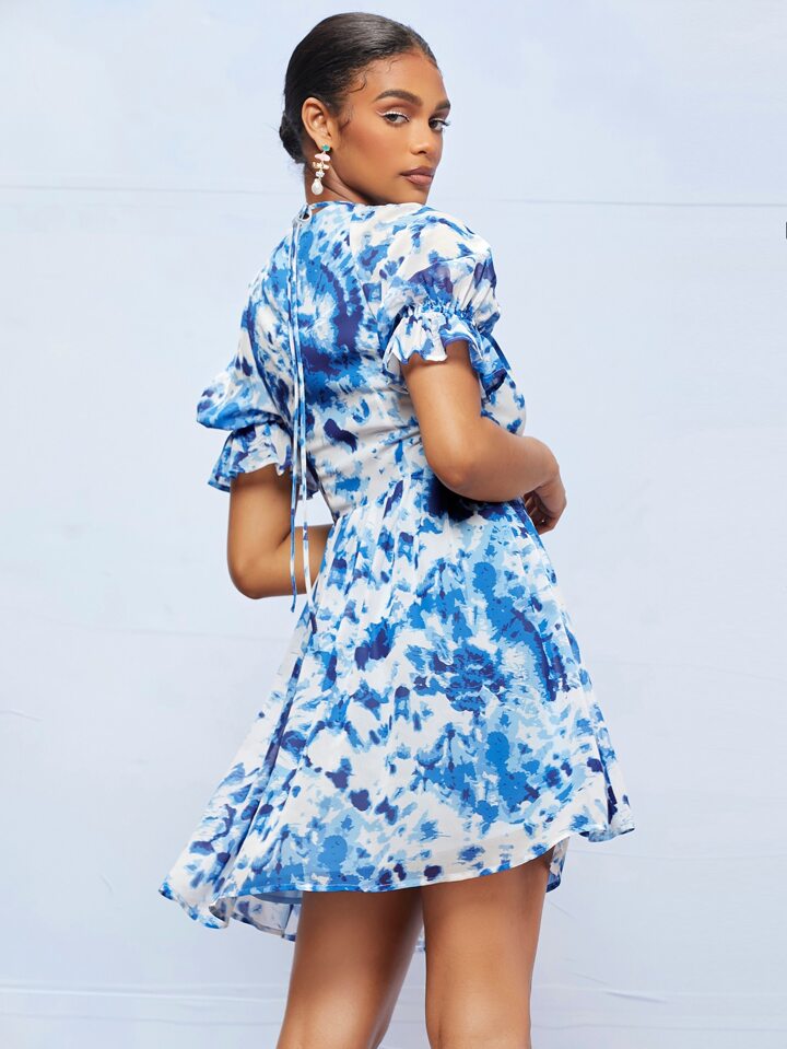 Puff Sleeve Crisscross Tie Back Tie Dye Dress