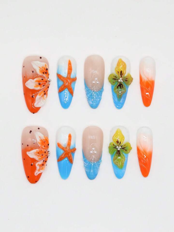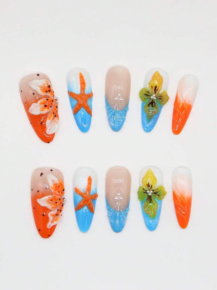 ROMWE Avant 10pcs High-Quality Handmade Starfish Flower Polka Dot False Nails +3 Sheets Double-Sided Adhesive, Y2K Style Detachable Rhinestone Gradient Ocean Elements Nail Art Stickers, Suitable For Holiday Parties, Dancing & Daily Wear