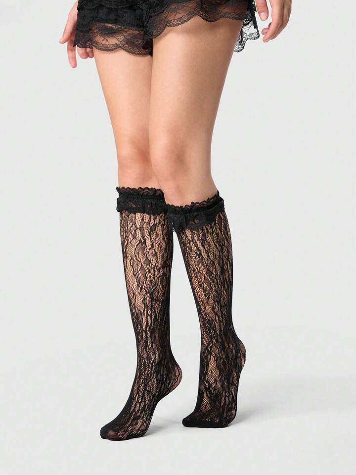 ROMWE Avant 2 Pairs Lace Trim Mid-Calf Socks, Cute Jacquard Knee High Black And White Stockings, Versatile Preppy Style For Women