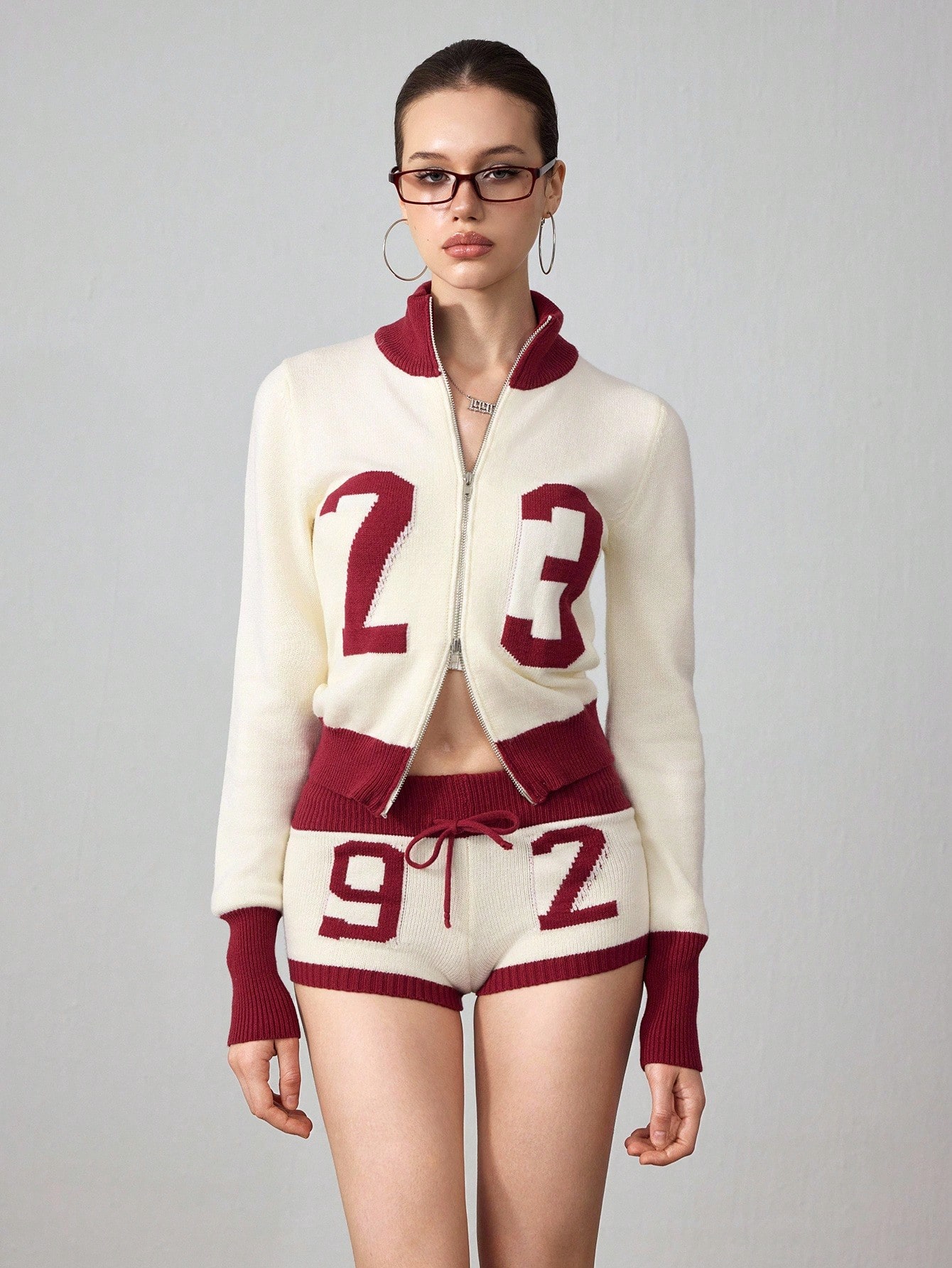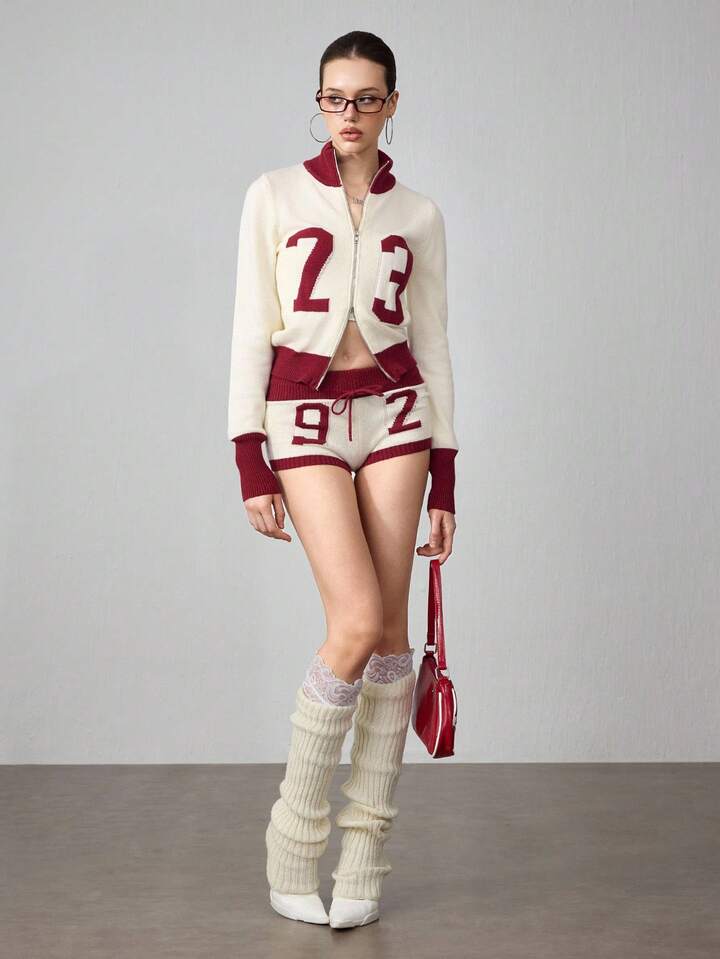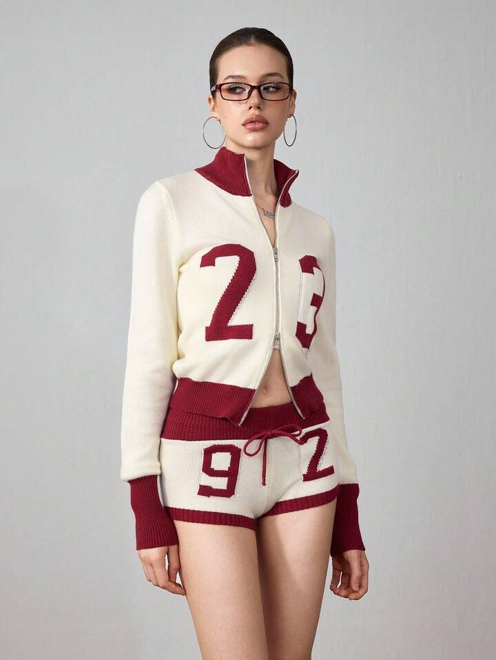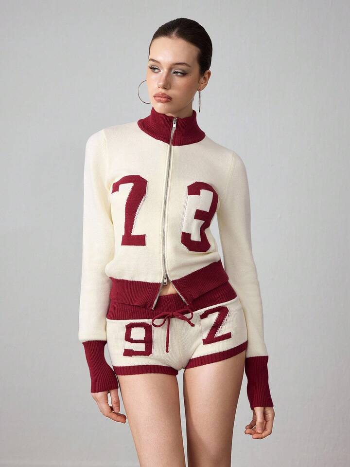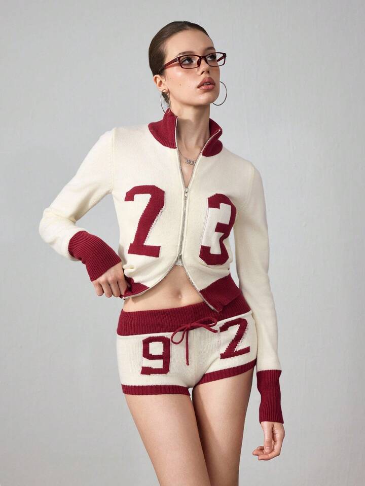 ROMWE Avant 2pcs Women Millennium Babe Retro Numeric Pattern Cardigan And Shorts Knit Set