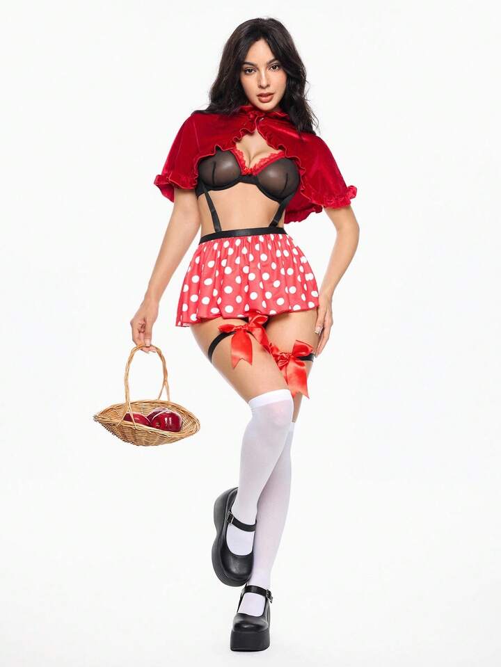 ROMWE Avant 5pcs Kawaii Sexy Lace Patchwork Bowknot Polka Dot Sheer Print Lingerie Set, Cosplay Costume