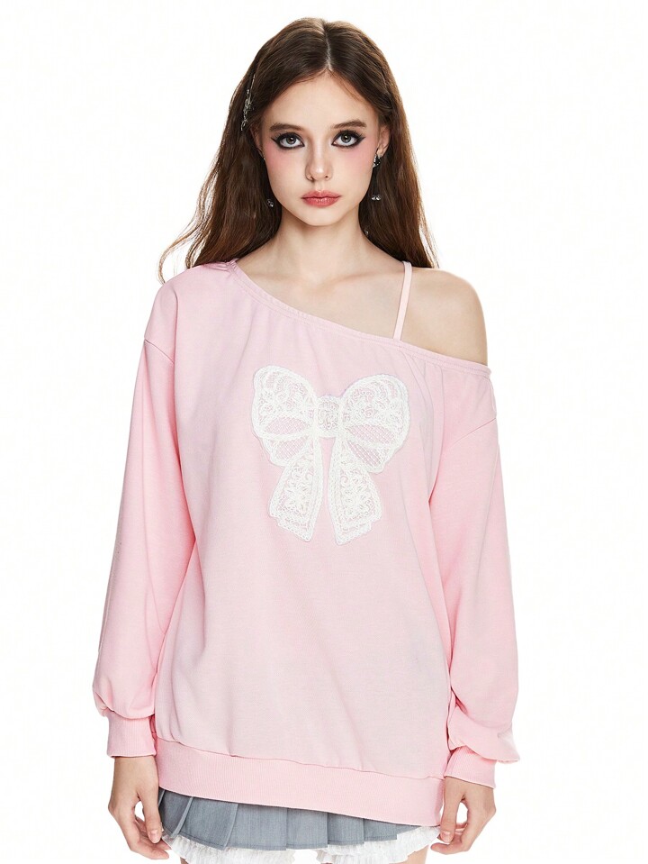 ROMWE Avant Cute Sweet Lace Bow Decor Asymmetrical Neck Women Sweatshirt