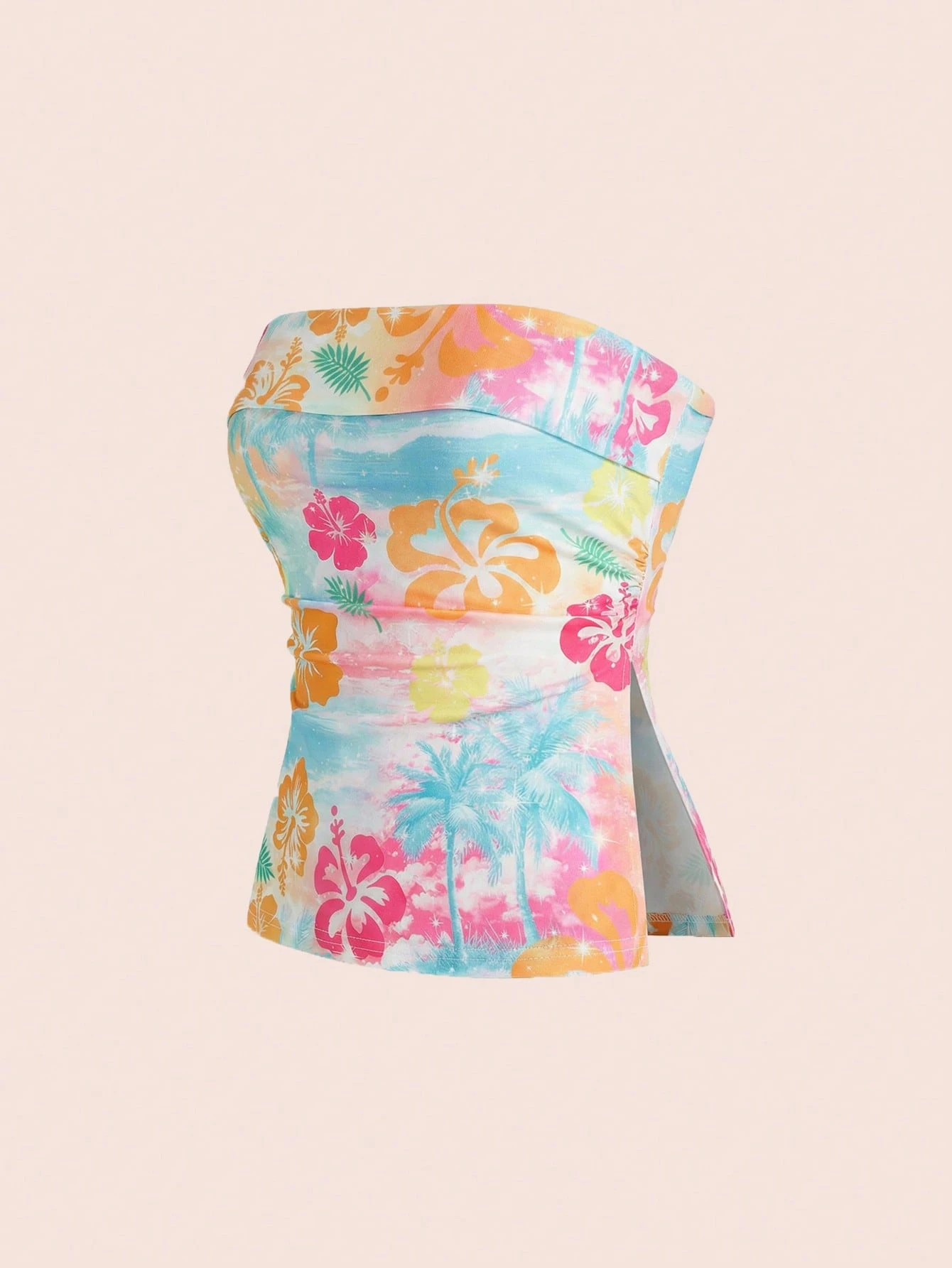 ROMWE Avant Floral Print Tube Crop Top With Y2K Hem Slit Design, Vacation Island Style