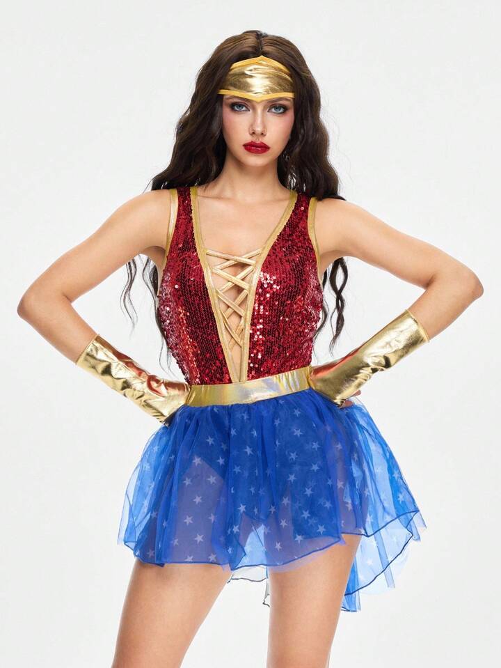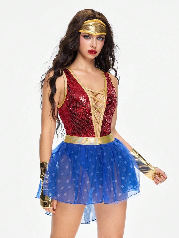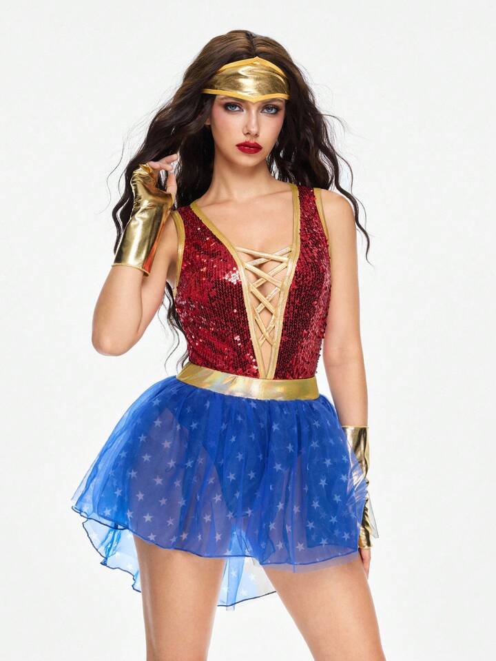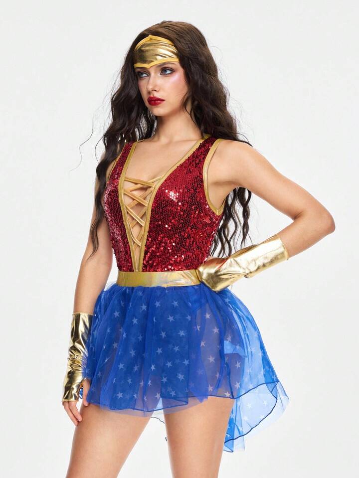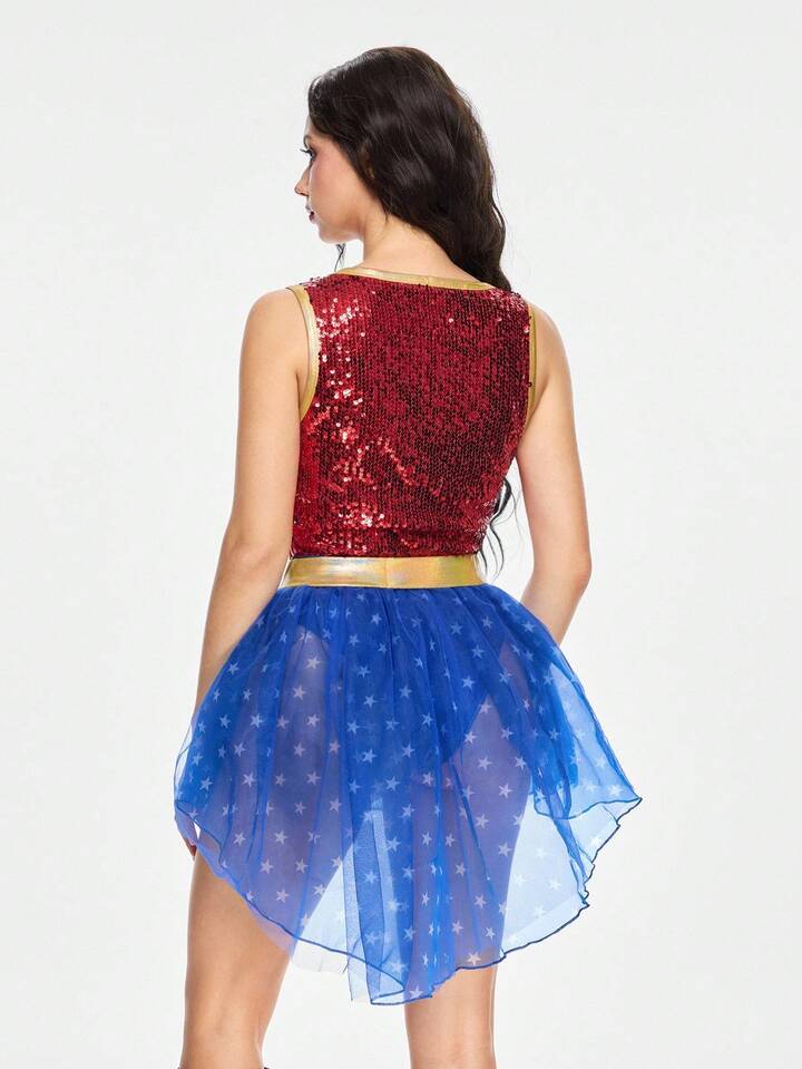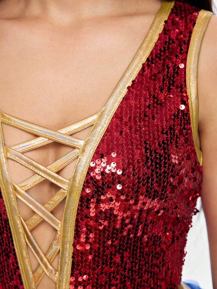 ROMWE Avant Halloween Cosplay Outfit - Sequin Deep V Jumpsuit And Star Mesh Mini Skirt Set