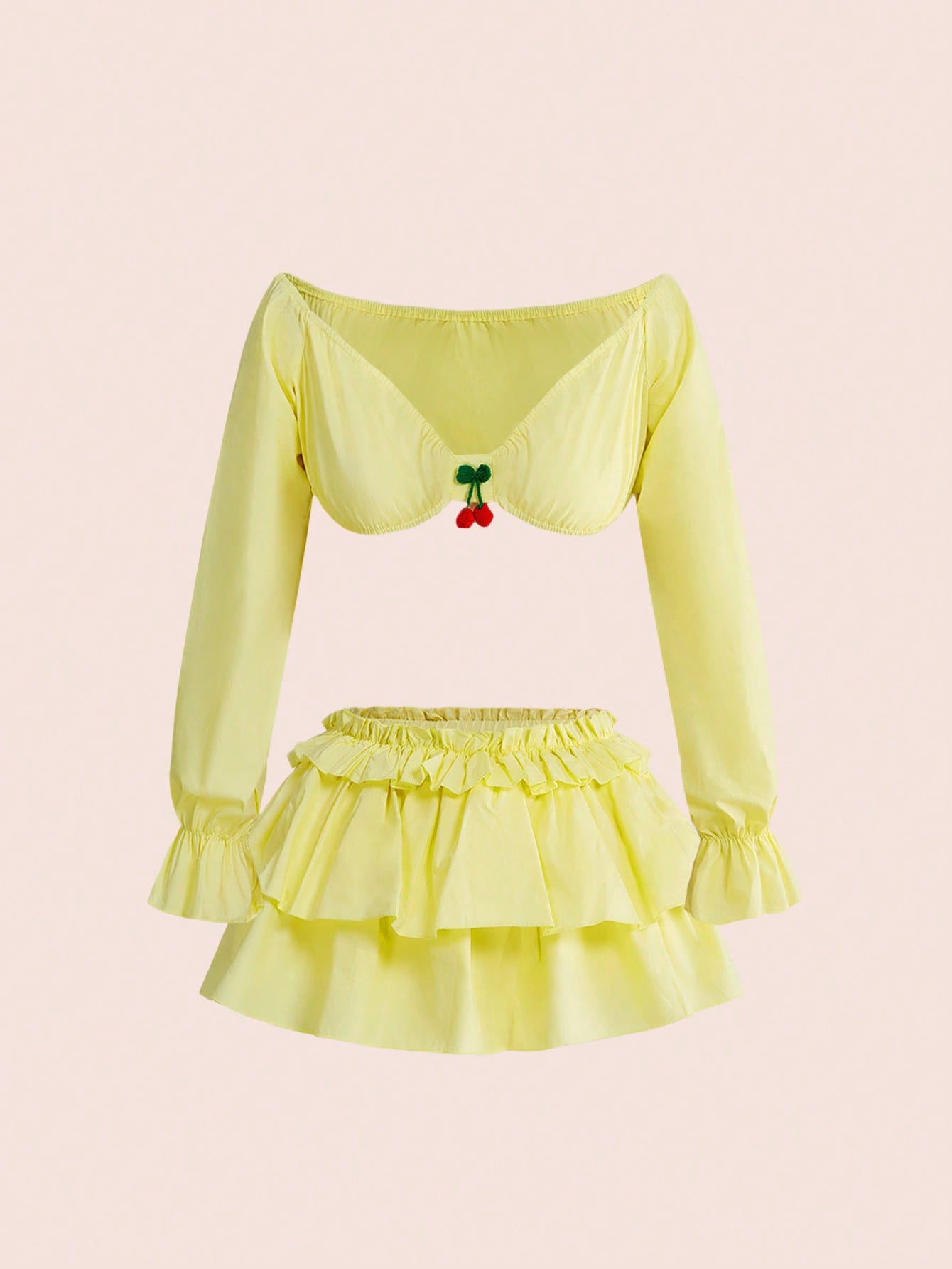 ROMWE Avant Island Vacation Style Fresh & Sexy Cherry Print Chiffon Cover Up 2 Pieces Set For Women