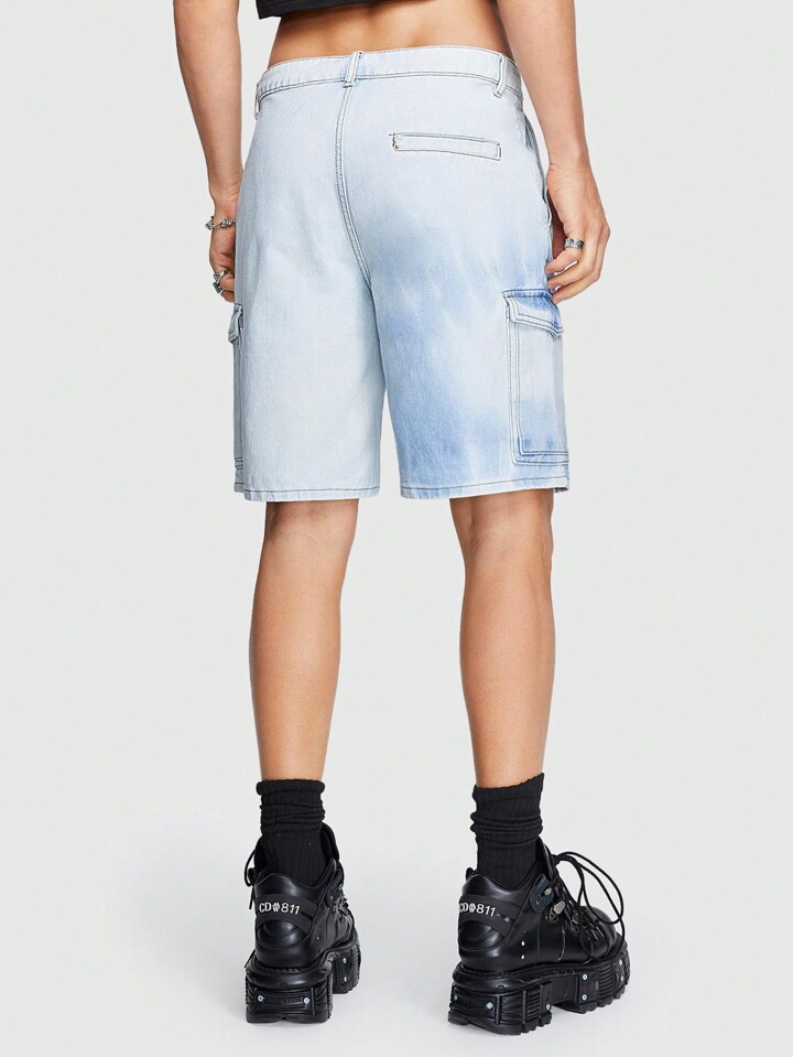ROMWE Avant Men's Stone Washed Cargo Denim Shorts, Suitable For Daily Wear In Spring And Summer