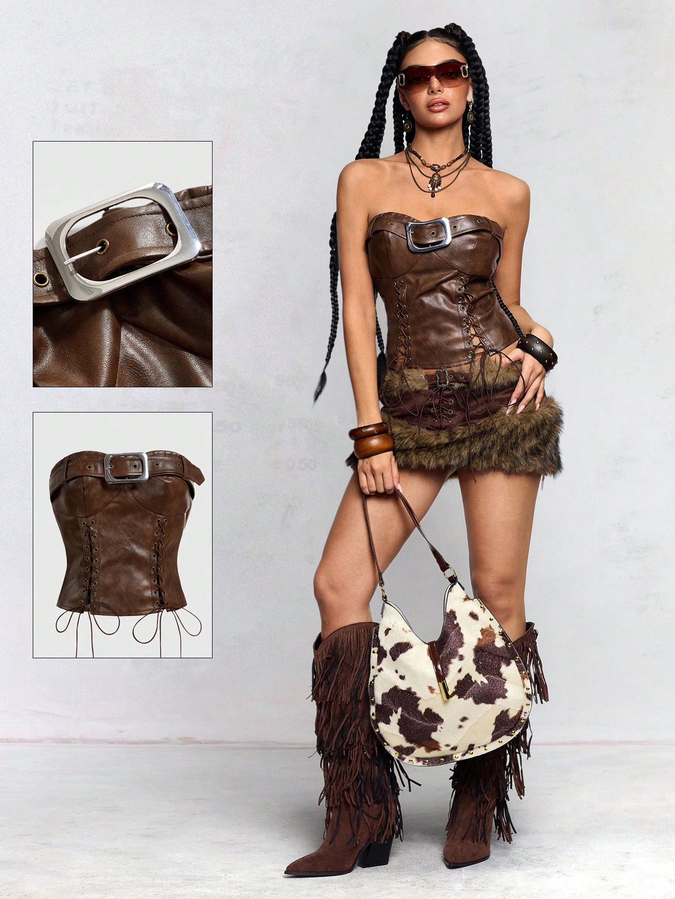 ROMWE Avant Miralda Distressed Leather Lace-Up Bandeau Sexy Crop Top