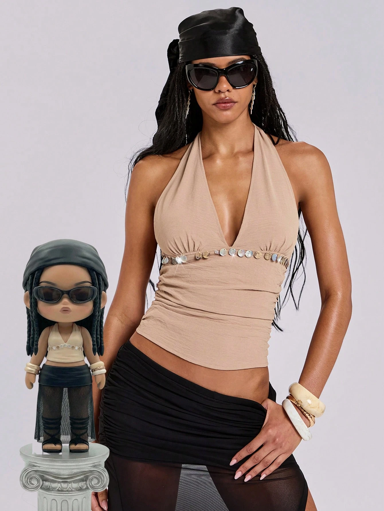 ROMWE Avant Spring/Summer Vacation Outfit Seashell Pendant Fitted Deep V-Neck Sleeveless Top For Women