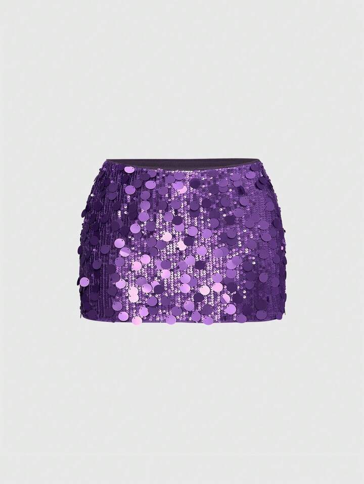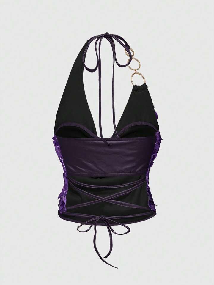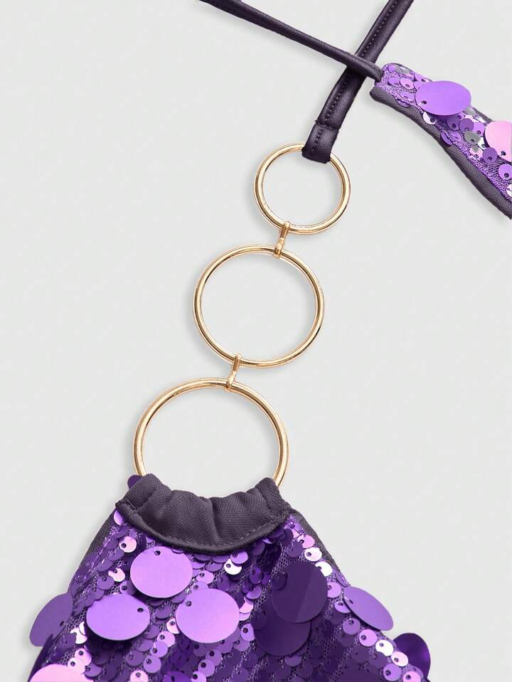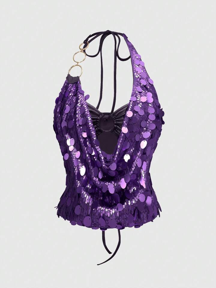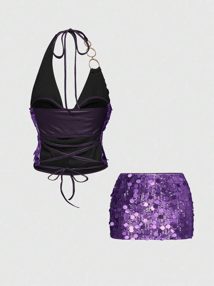 ROMWE Avant Vintage Sexy Y2K Party Sequin Halter Crop Top And Low Waist Mini Skirt 2-Piece Set For Women