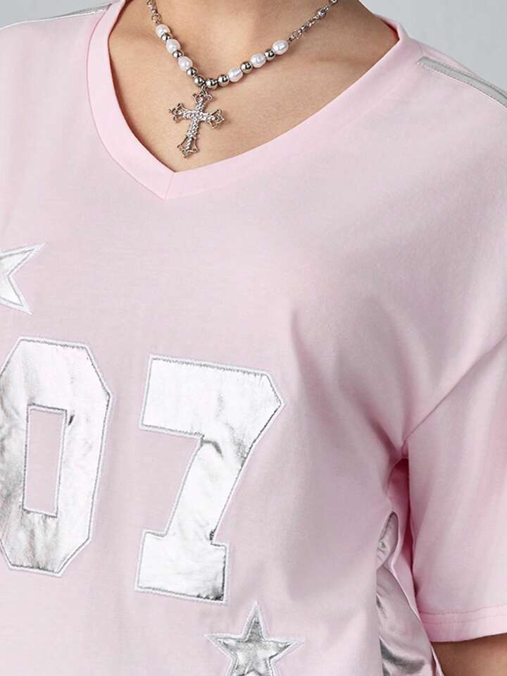 ROMWE Avant Women Y2K Retro Football Graphic Silver Coated Fabric Patchwork T-Shirt