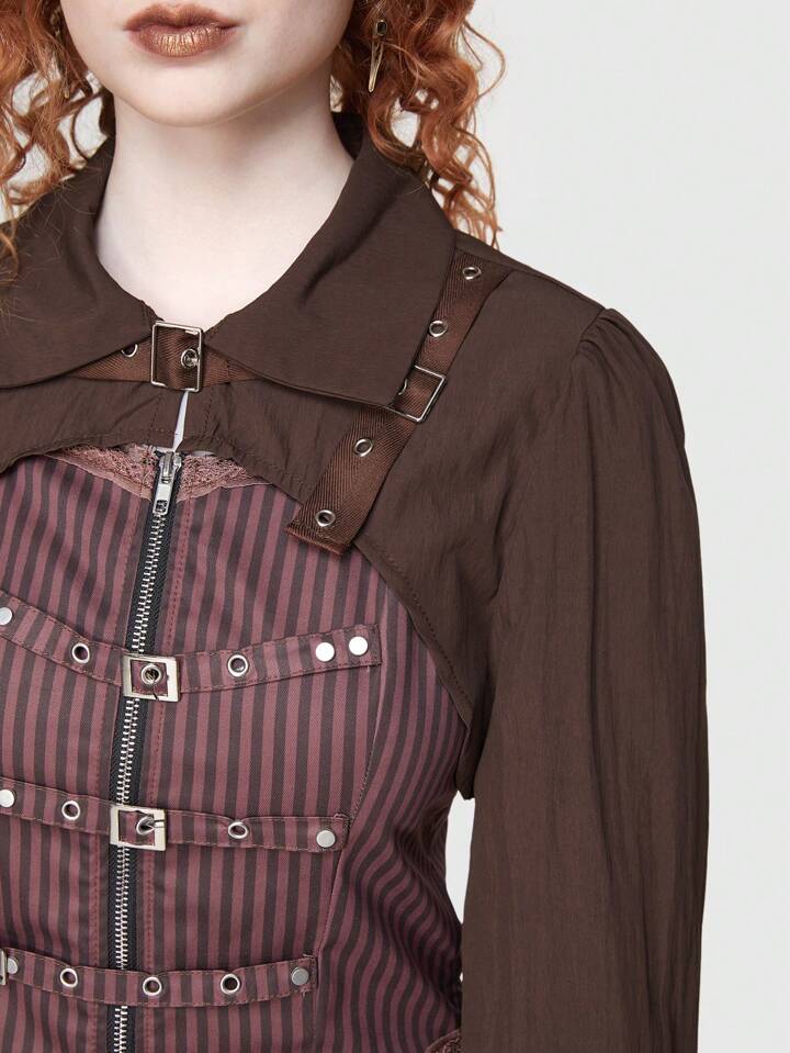 ROMWE Avant Women's Brown Turn Down Collar Long Sleeve Shirt