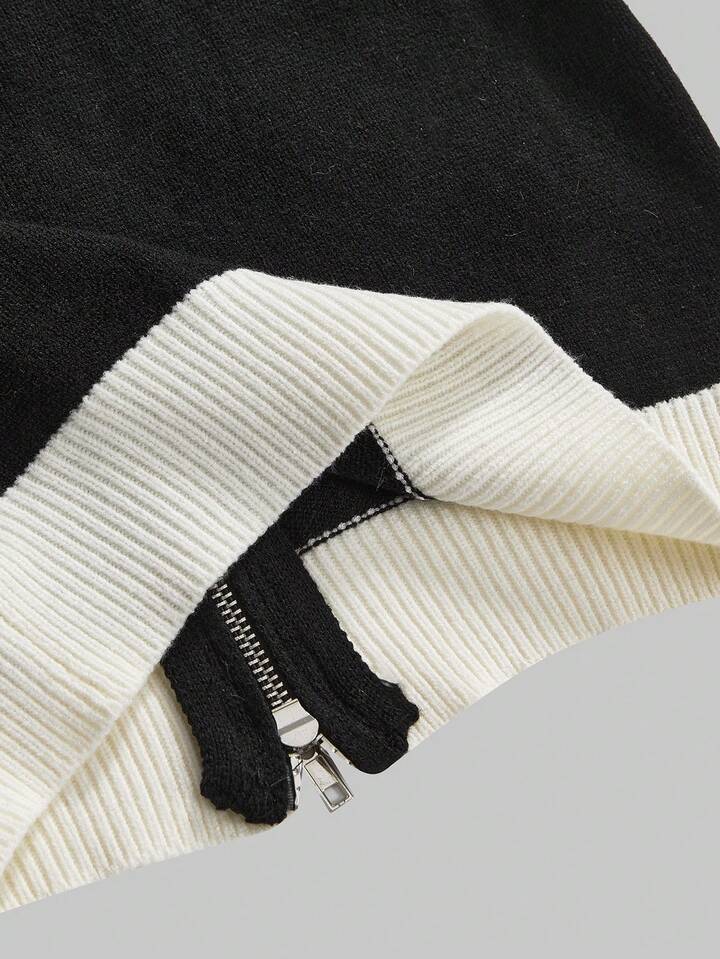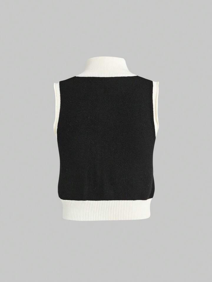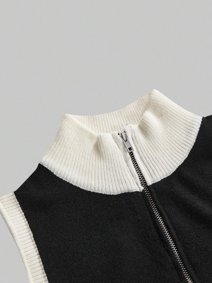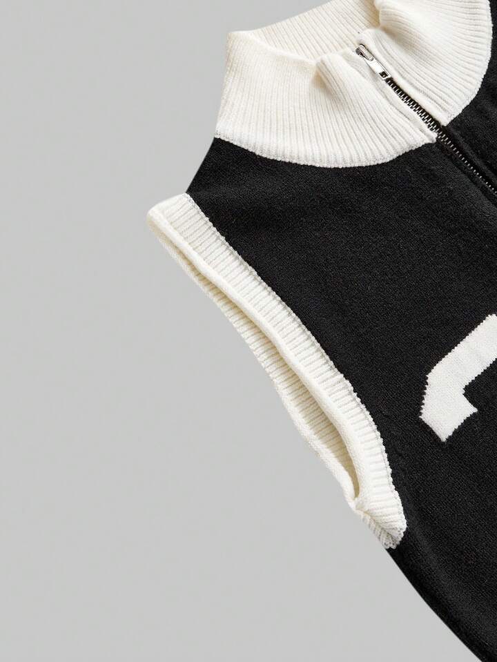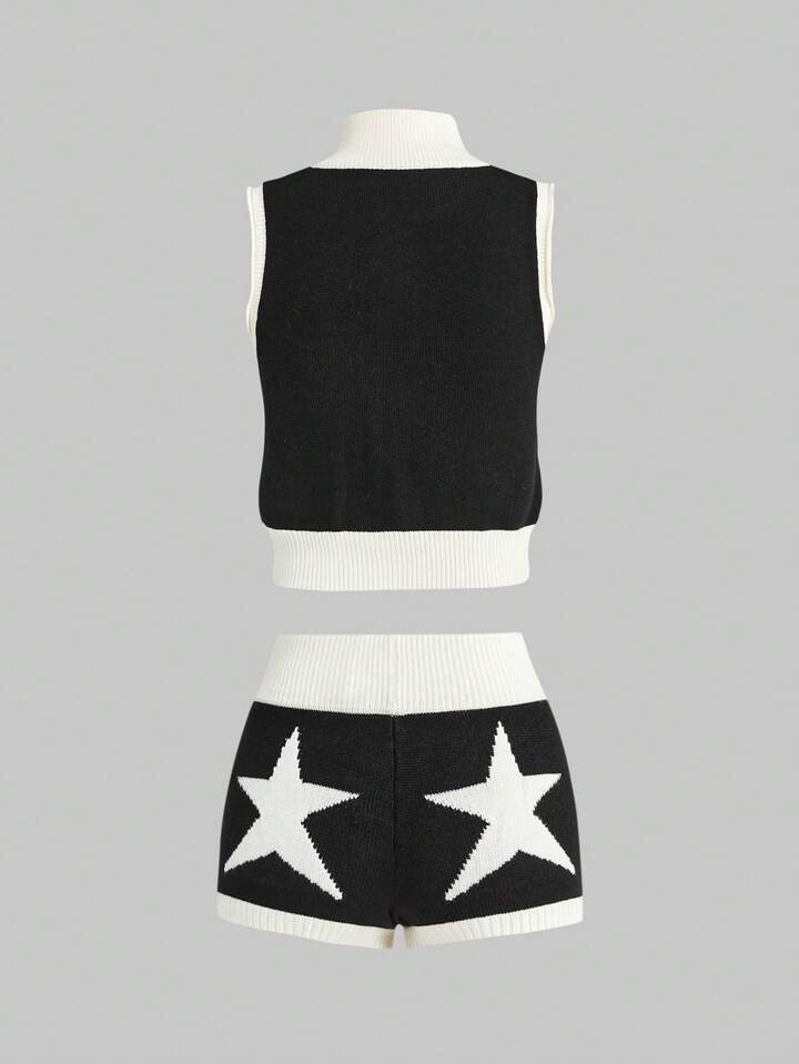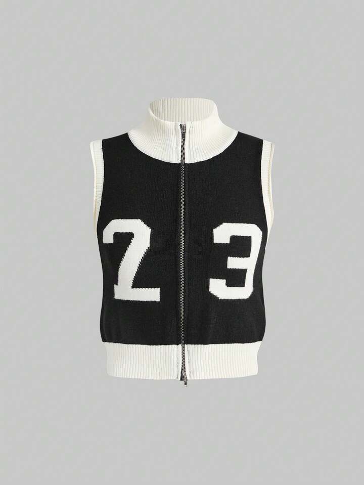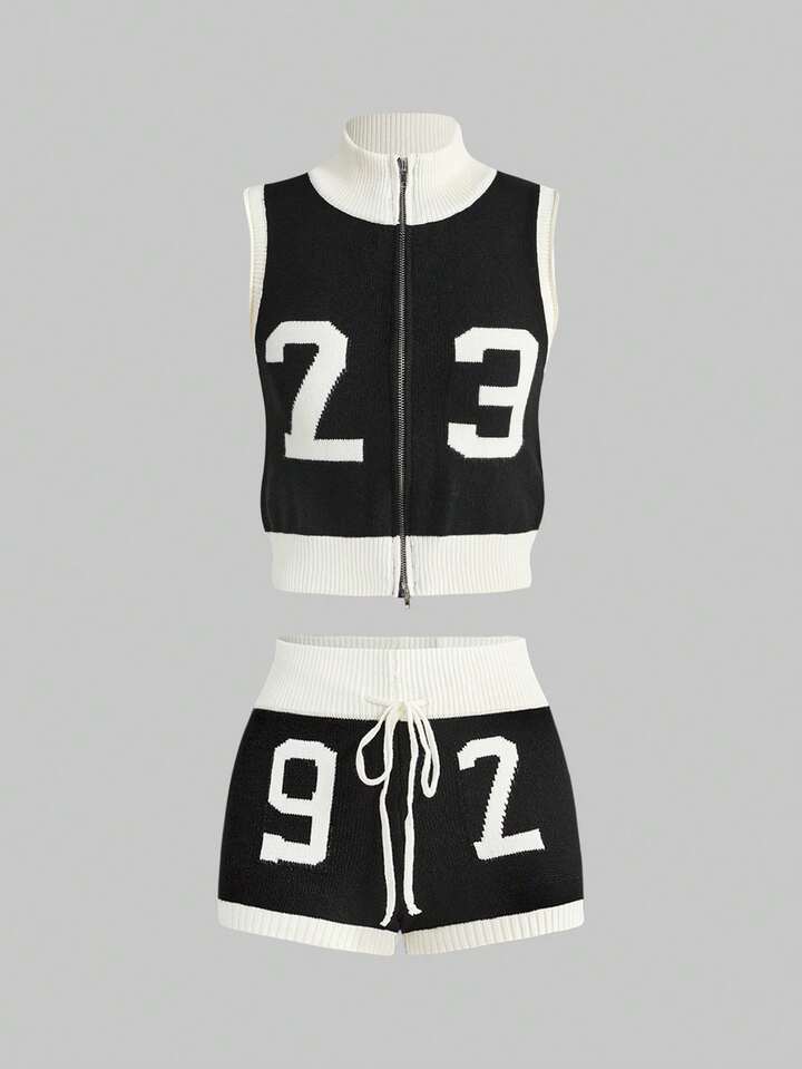 ROMWE Avant Women's Casual Fashion Street Sporty Collegiate Numeric Pattern Contrast Color Turtleneck Sleeveless Zip-Up Cardigan And Drawstring Waist Knit Shorts 2-Piece Set