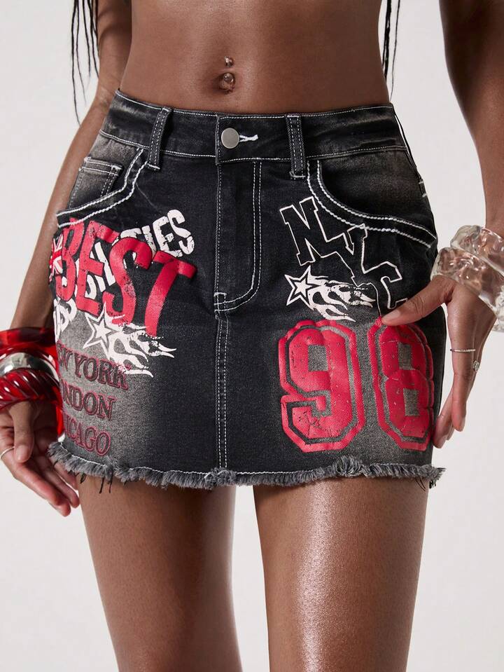 ROMWE Avant Women's Retro College Style Back To School Slogan Logo Embroidered Denim Bodycon Mini Skirt