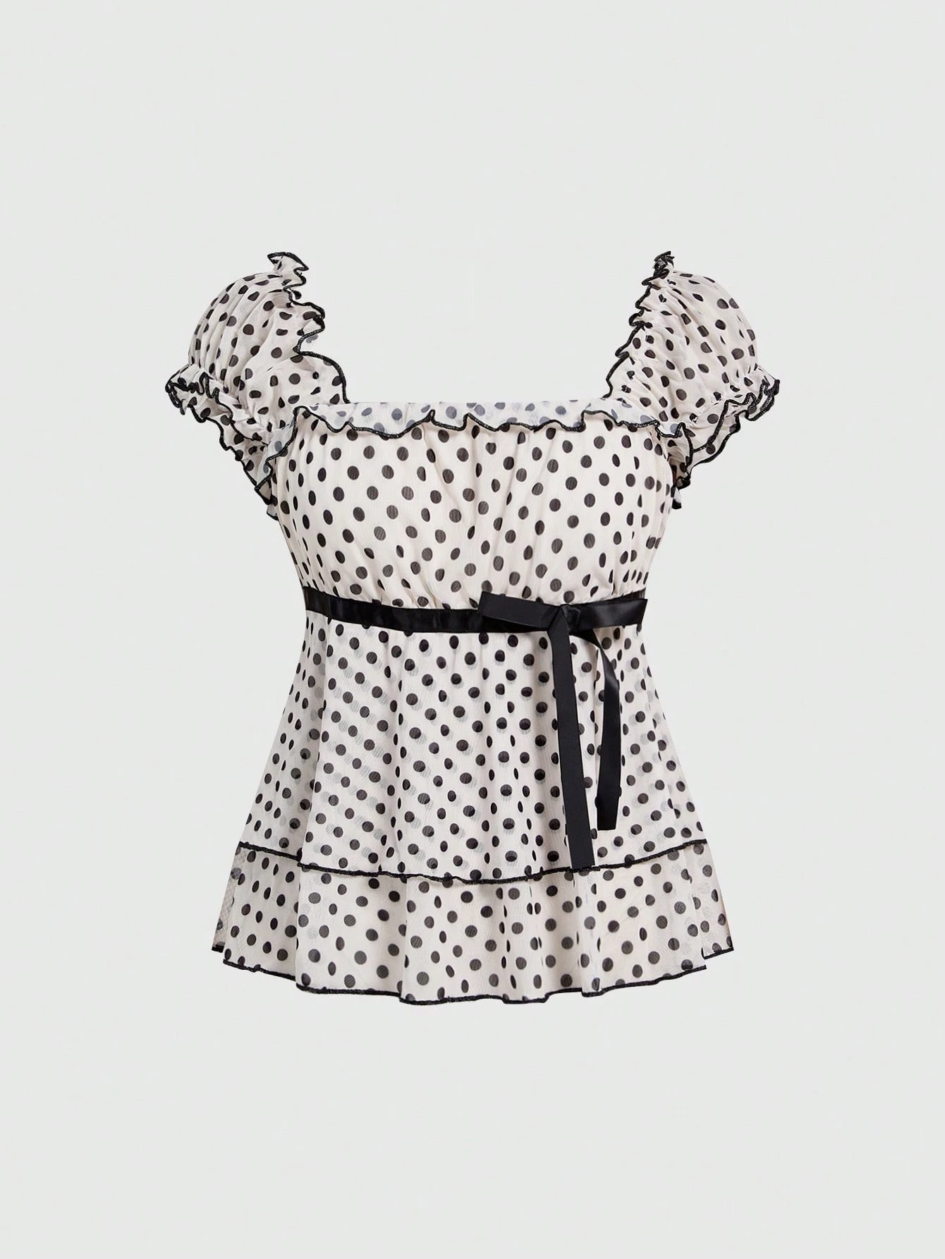 ROMWE Avant Women's Retro French Romantic Vacation Style Polka Dot Contrast Color Print Smock Ribbon Decor T-Shirt