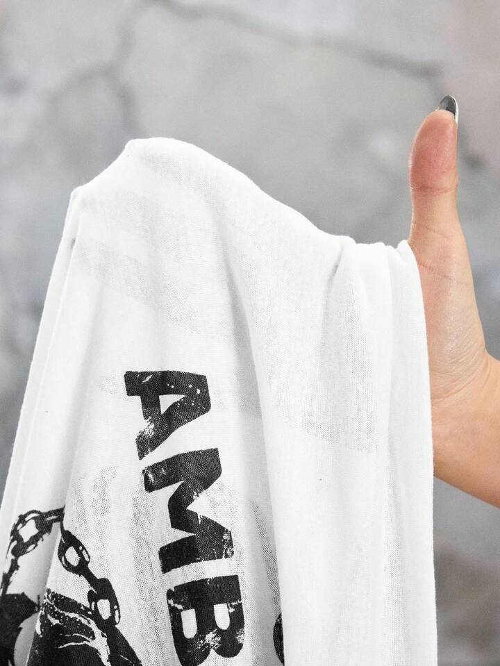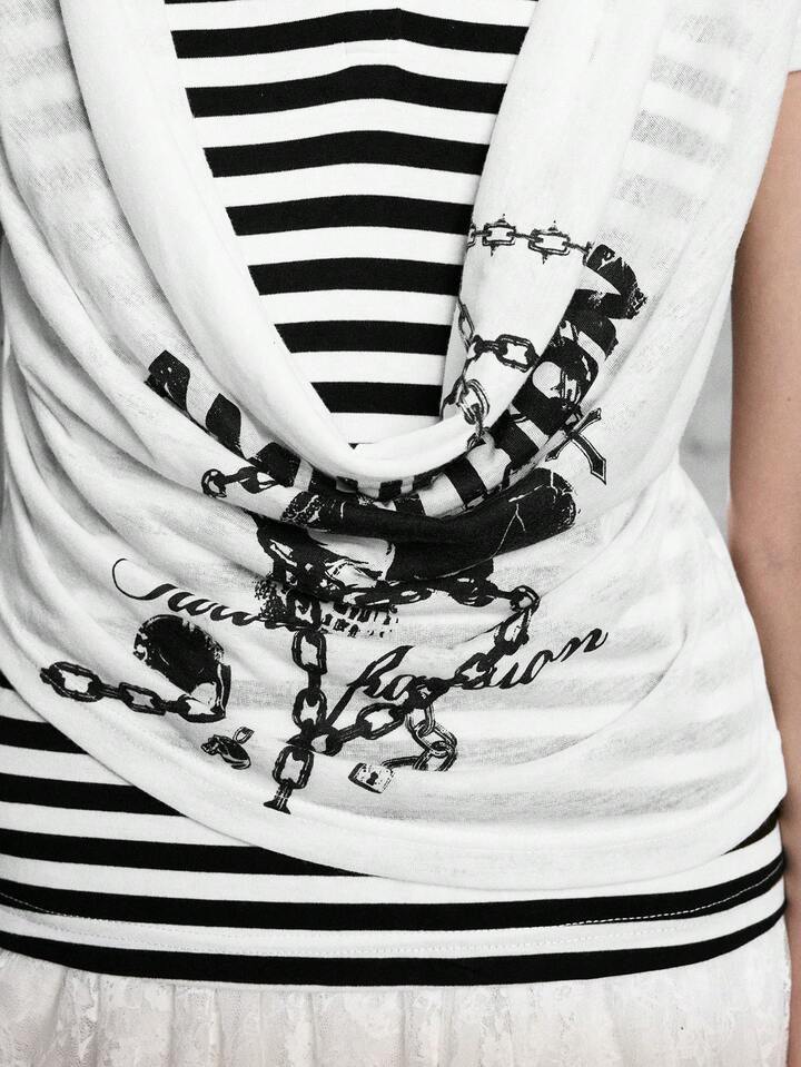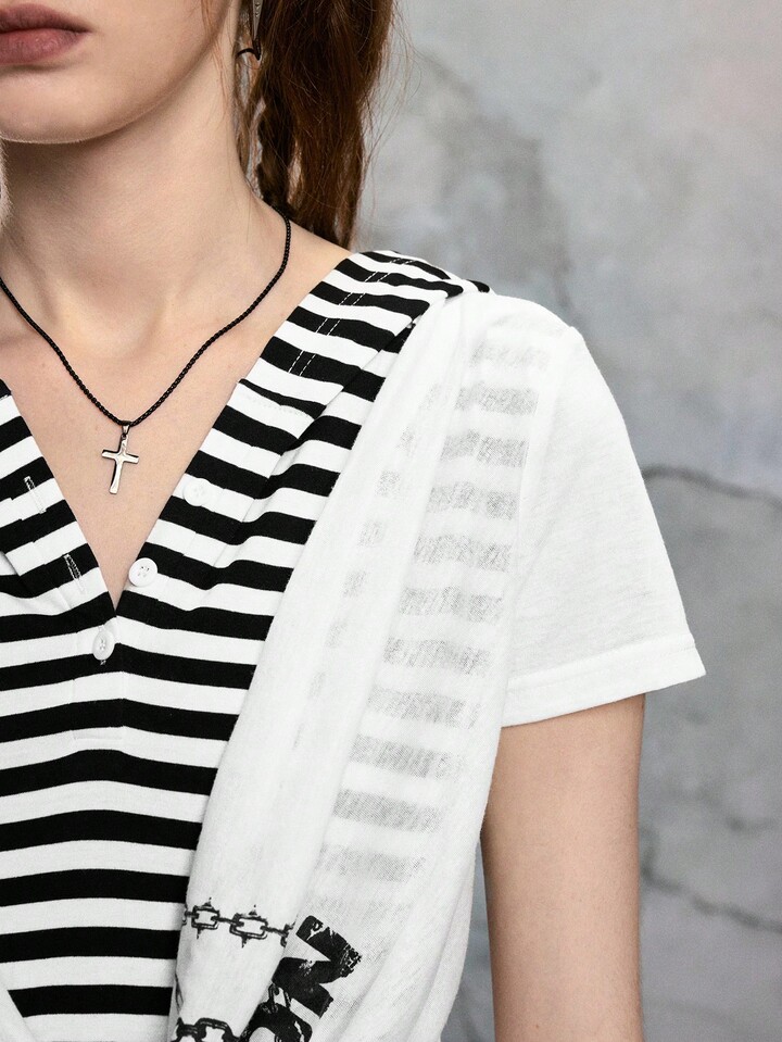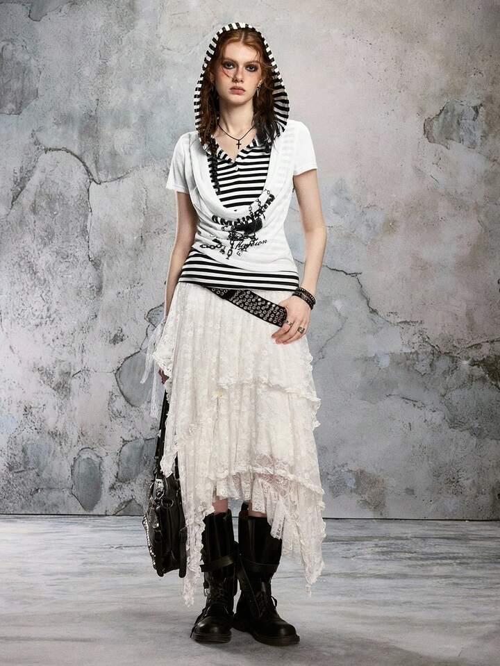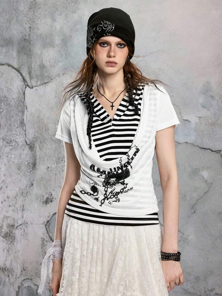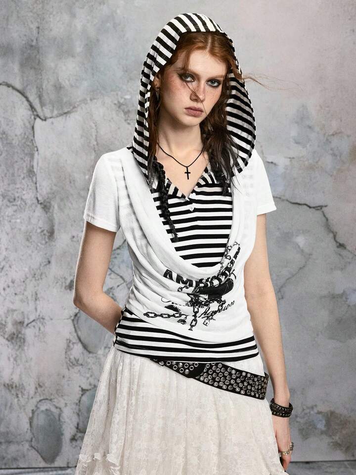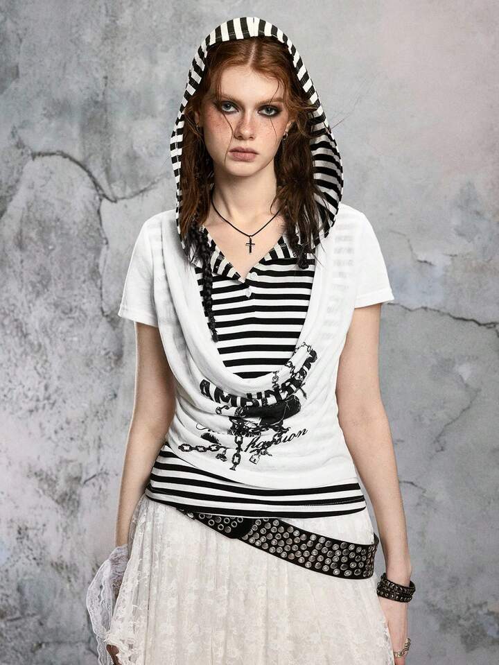 ROMWE Avant Women's Retro Y2K Dystopian Striped Patchwork Hooded Loose Neck Skeleton Chain Print T-Shirt