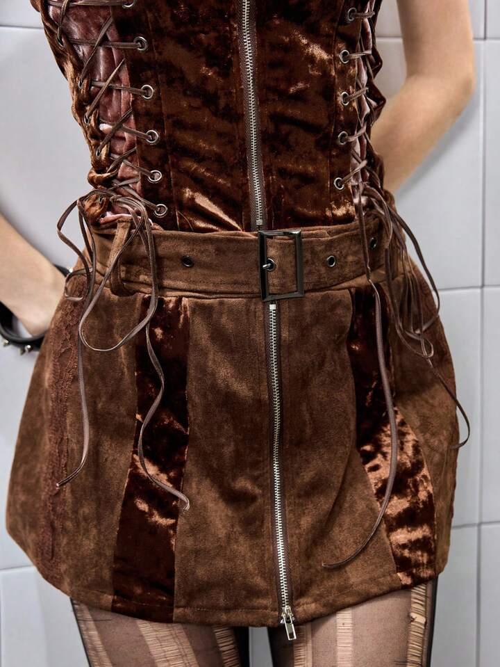 ROMWE Avant Women's Y2K Contrast Lace Grommet Tie-Up Zipper Front Fashionable Bustier Mini Dress