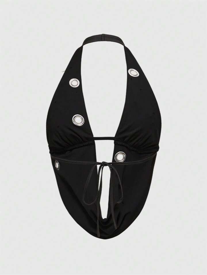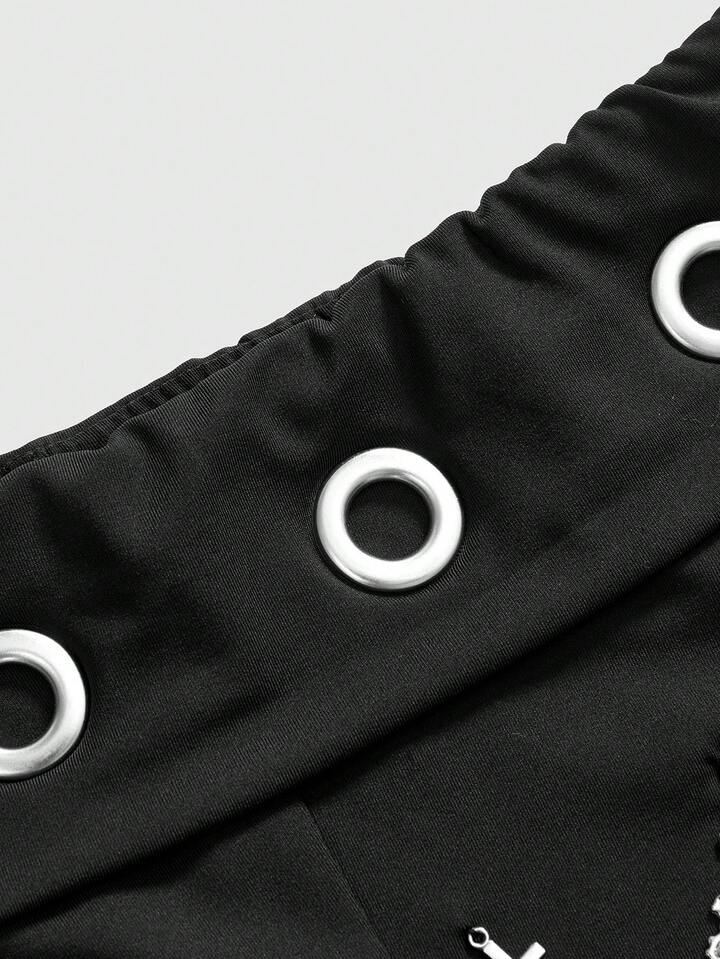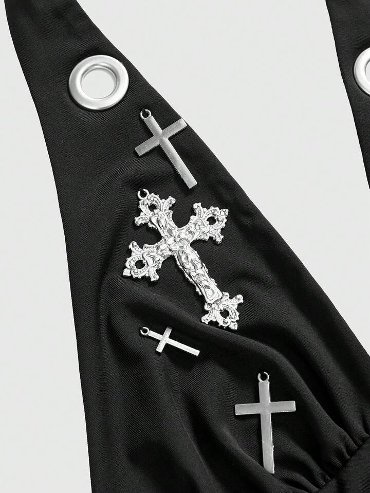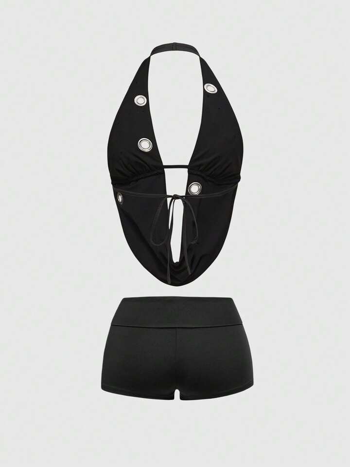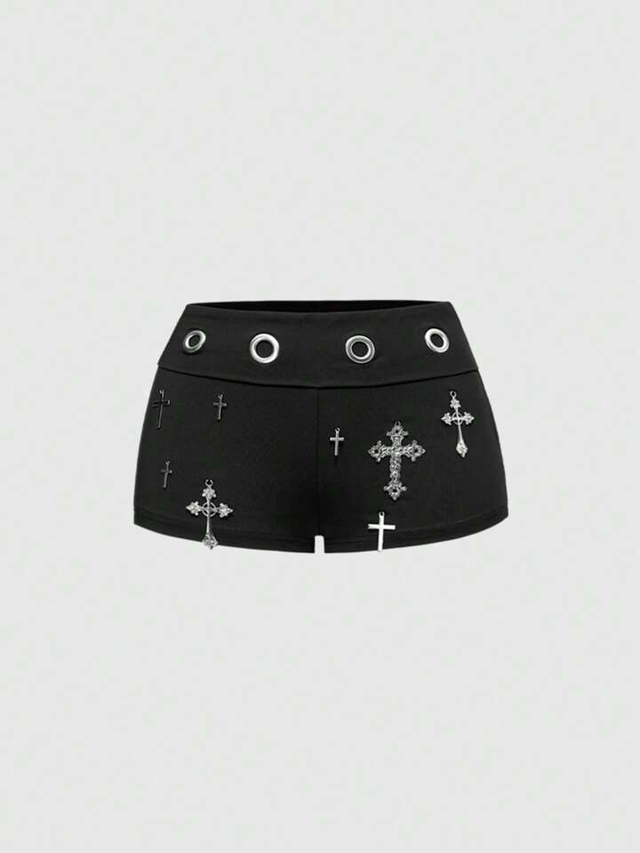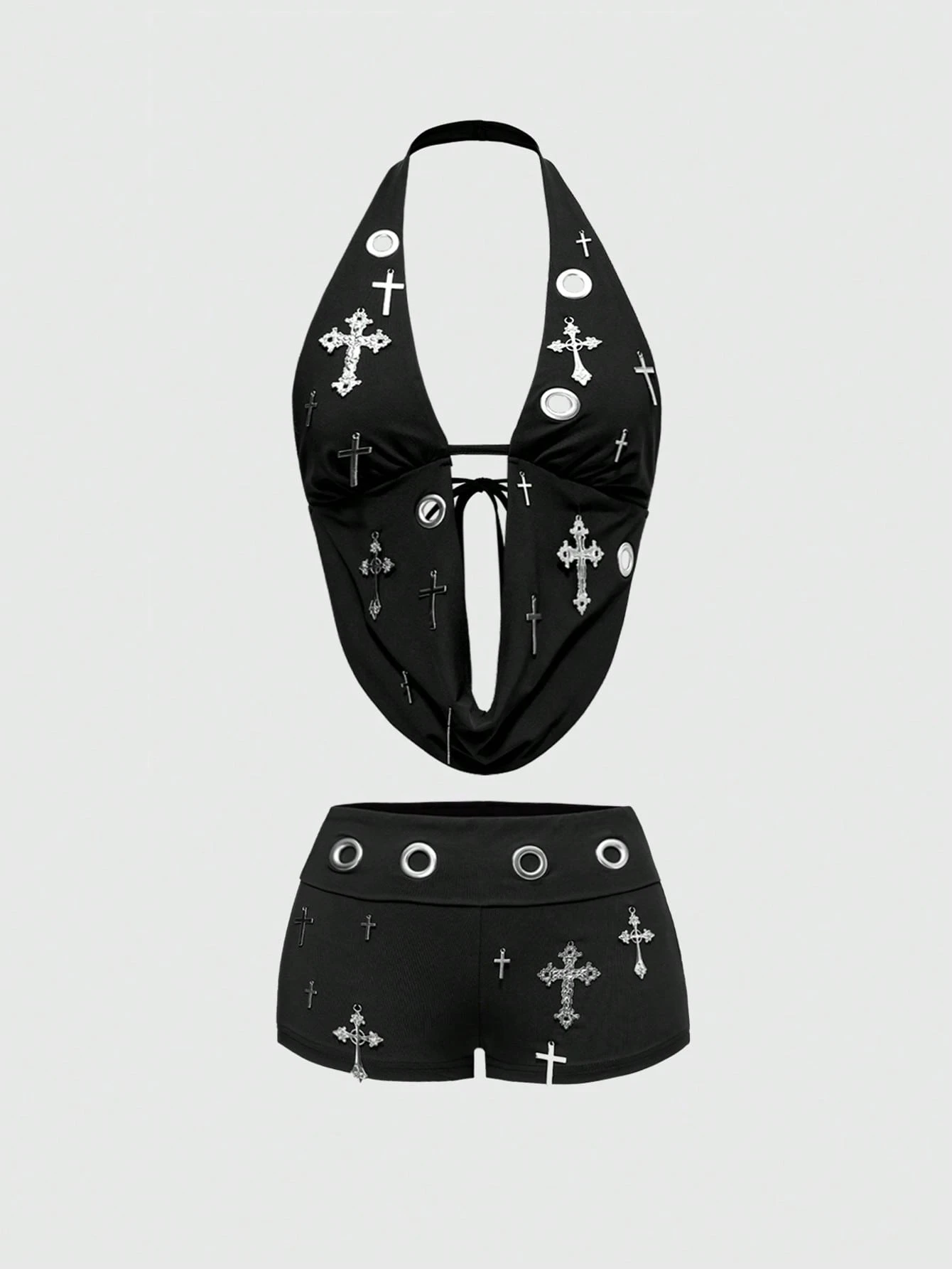 ROMWE Avant Y2K Baddie Streetwear Cross Metal Pendant Grommet Decor Crop Top And Shorts Set, Plus Size 2pcs Set