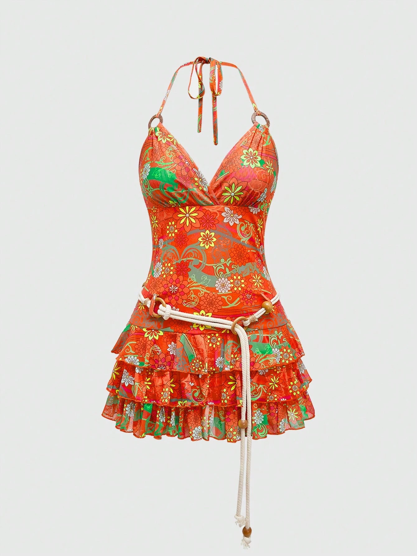 ROMWE Avant Y2K Hawaii Vacation Coconut Girl Floral Print Mini Mesh Skater Dress For Women