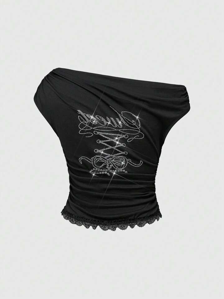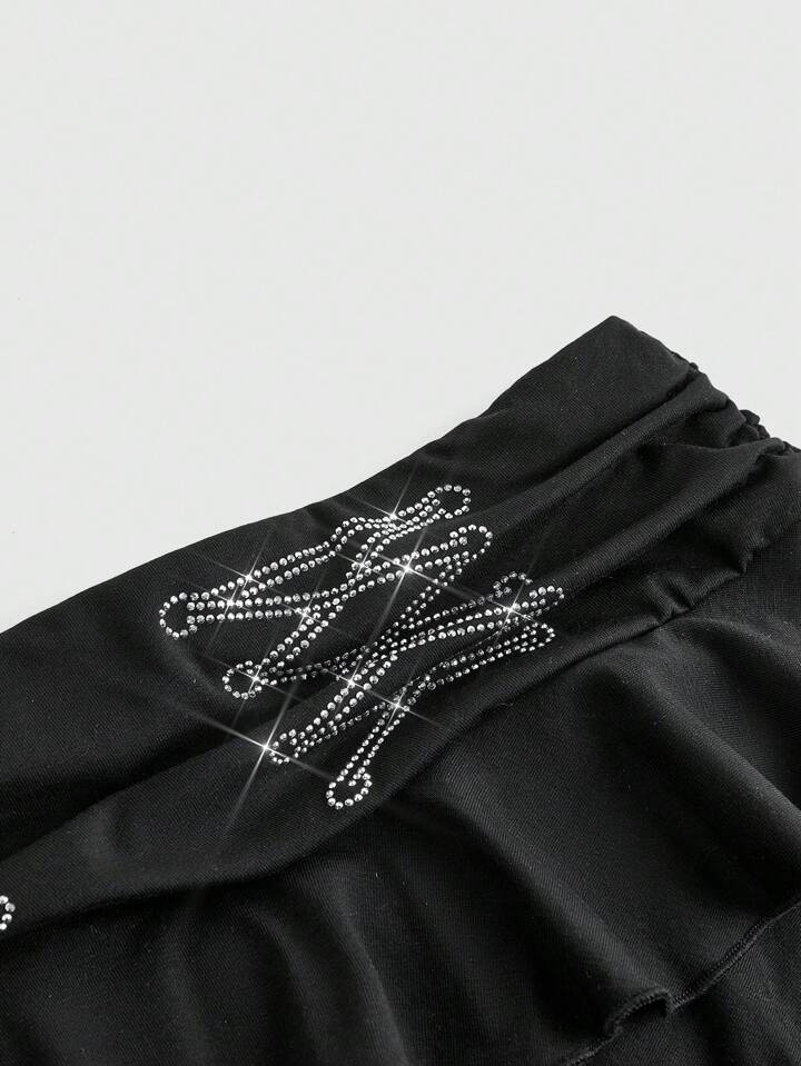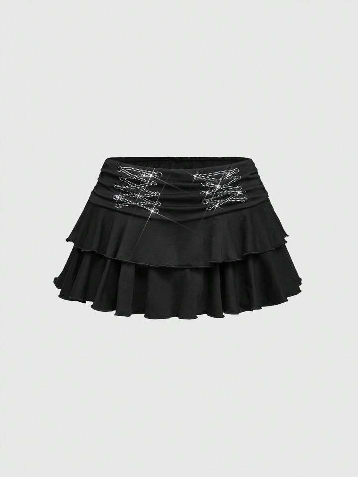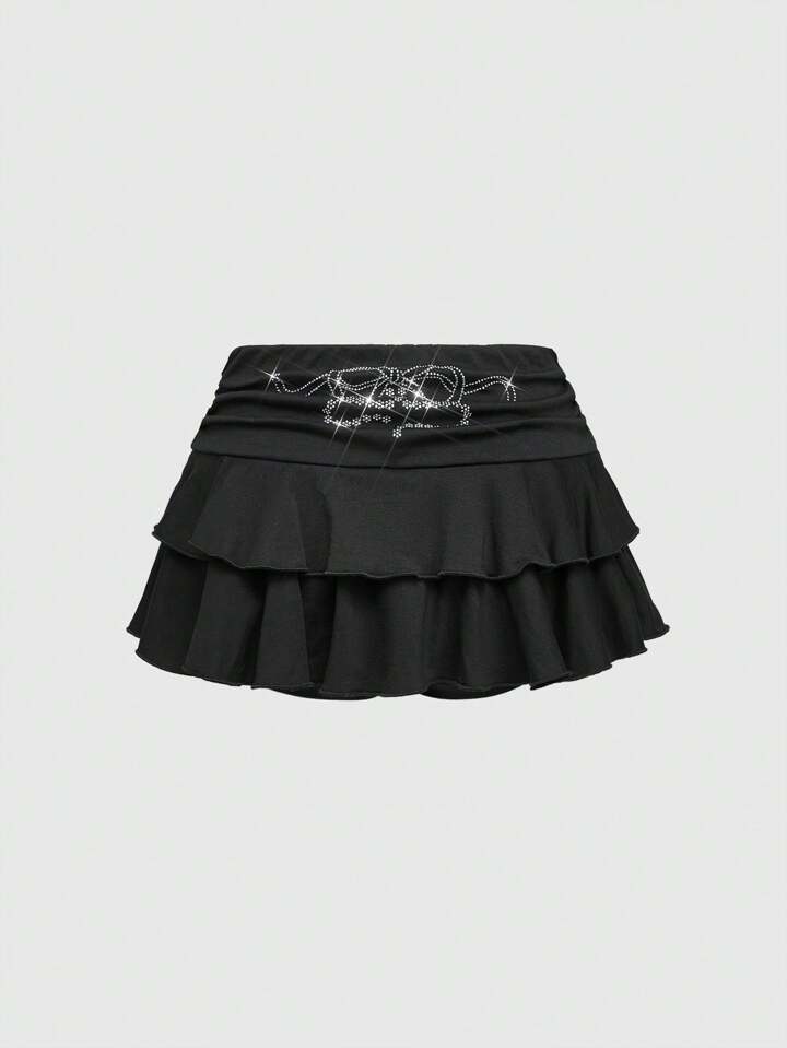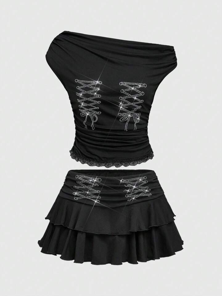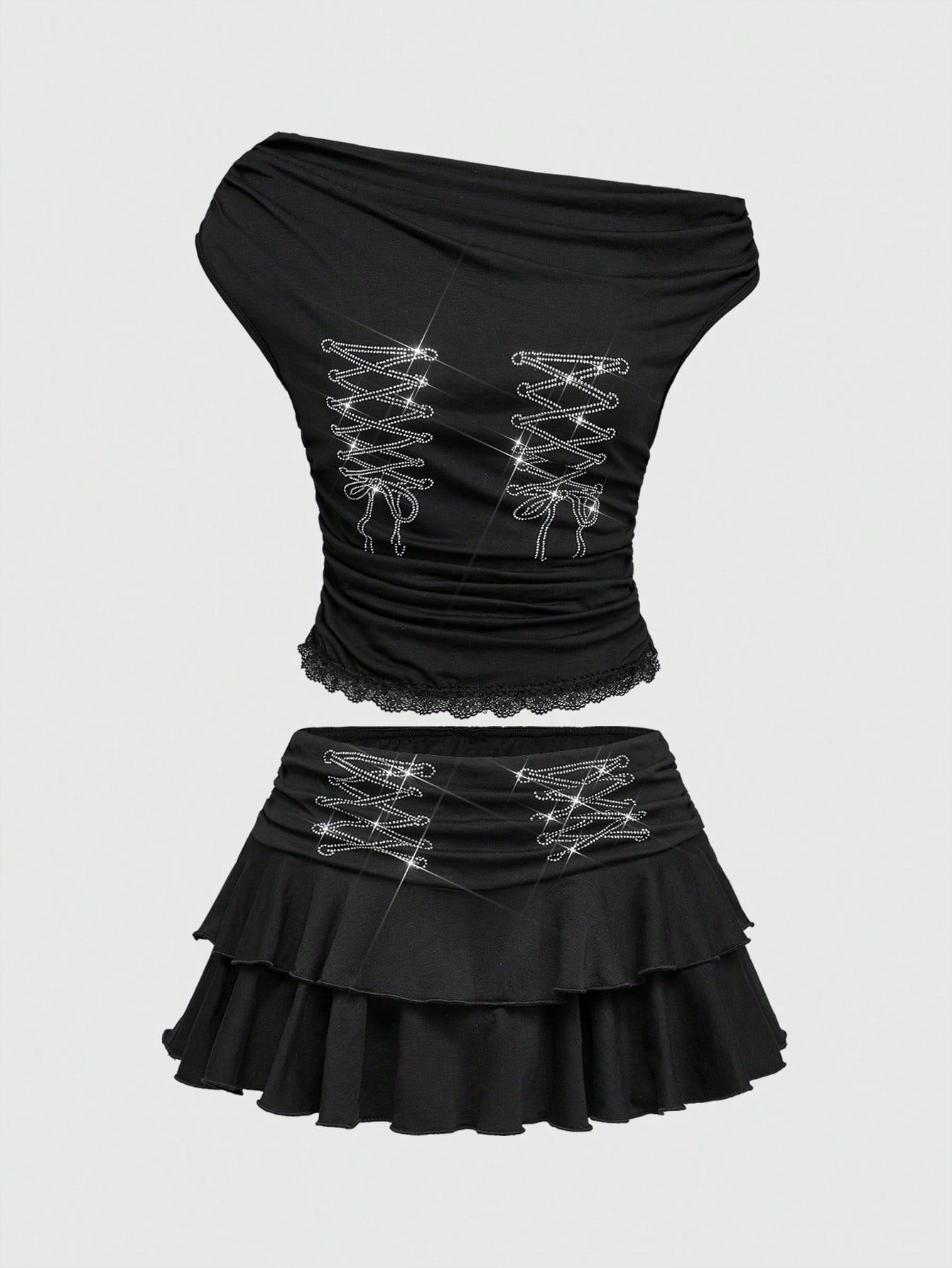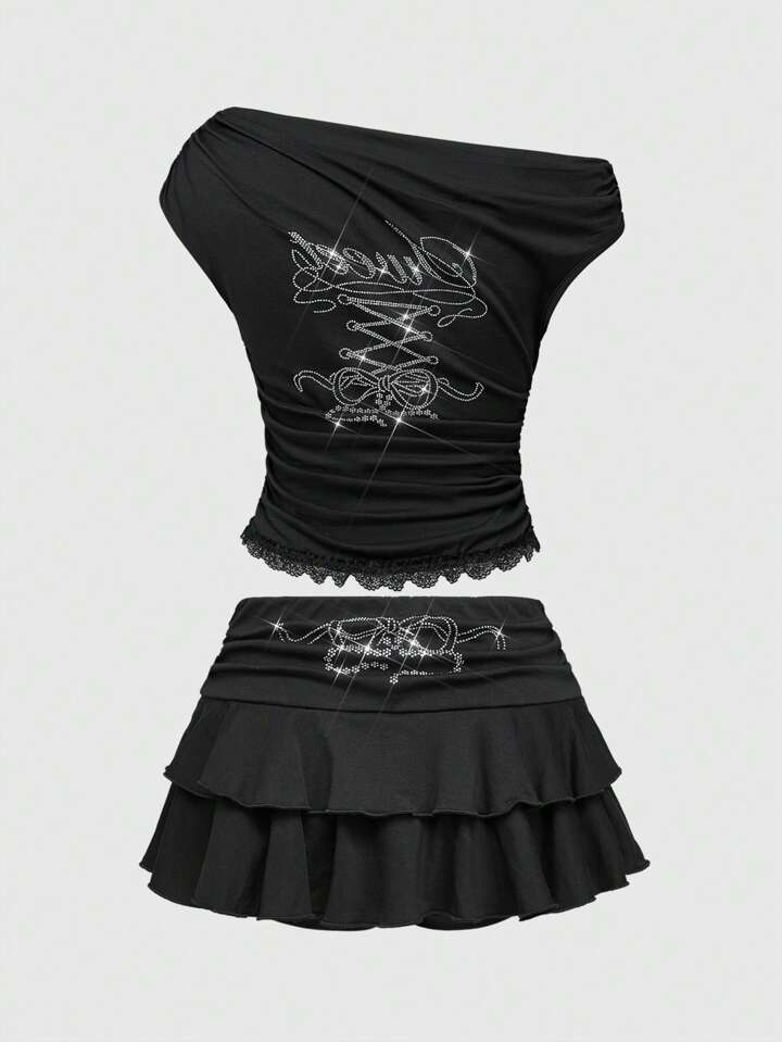 ROMWE Avant Y2K Style Asymmetrical Shoulder Tee & Ruffle Waist Rhinestone Decor Low-Rise Cake Skirt 2pcs Women Outfit