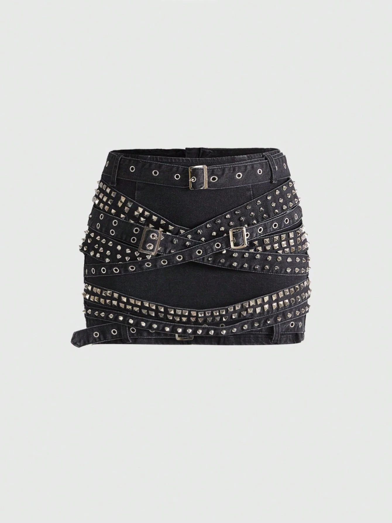 ROMWE Avant Y2K Vintage Punk Metal Rivet Grommet Decorated Women Denim Mini Skirt