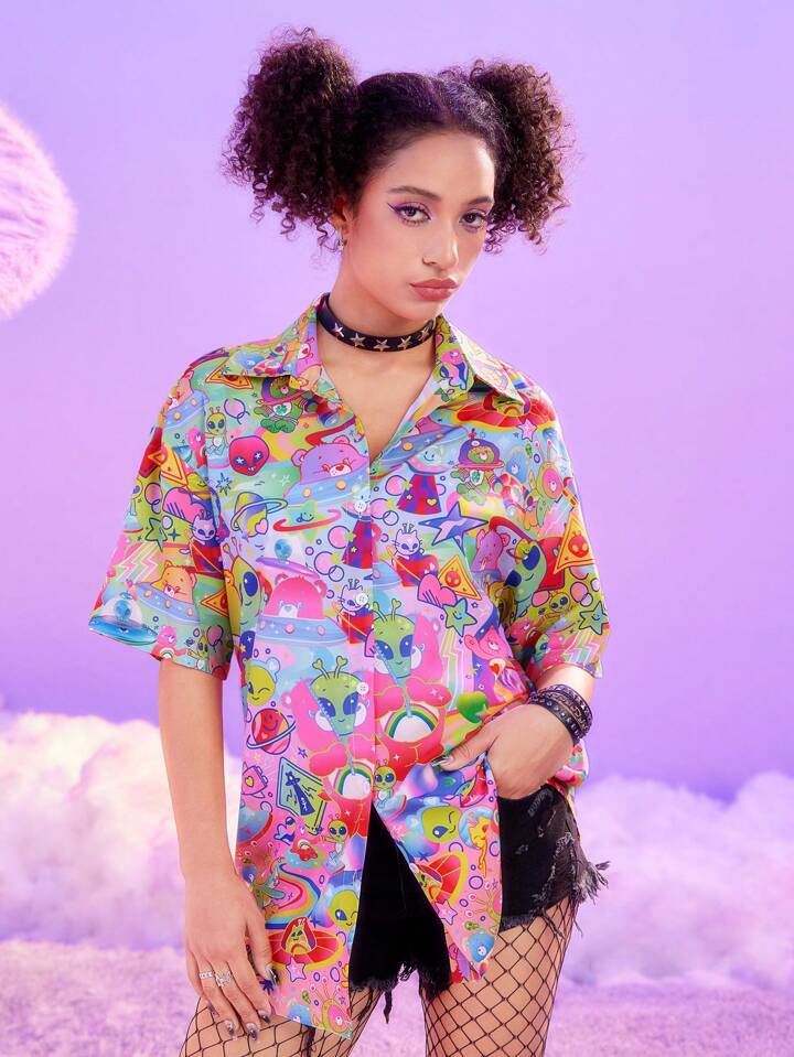 ROMWE X Care Bears Loose Fit Colorful Alien Printed Shirt