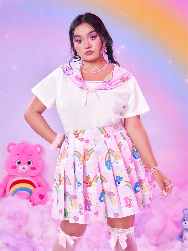 ROMWE X Care Bears Plus Bear Print Sailor Collar Blouse & Pleated Skirt
