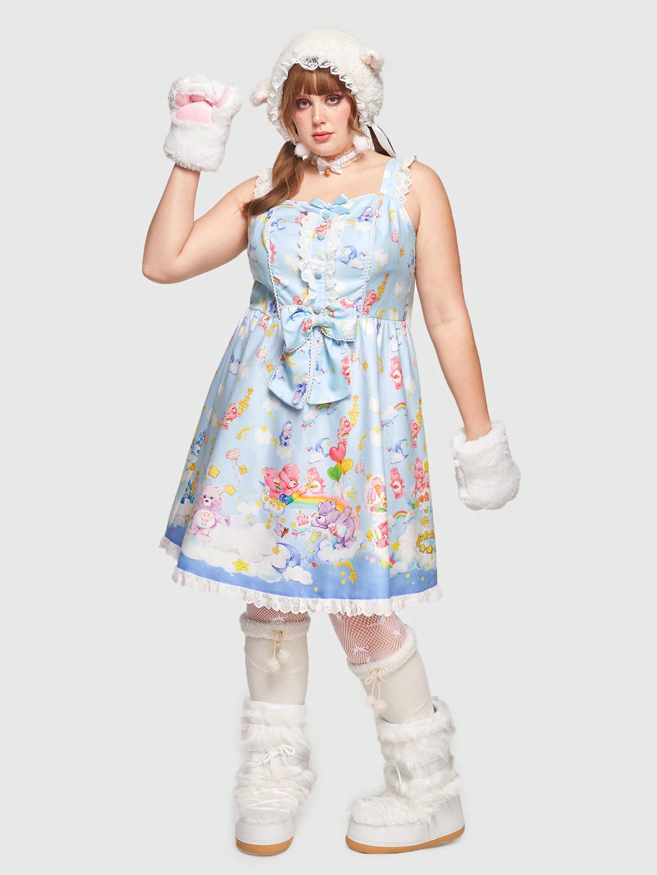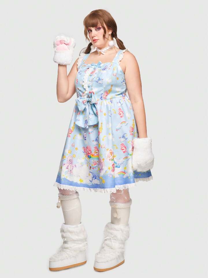 ROMWE X Care Bears Plus Cartoon Graphic Bow Front Lace Trim Dress