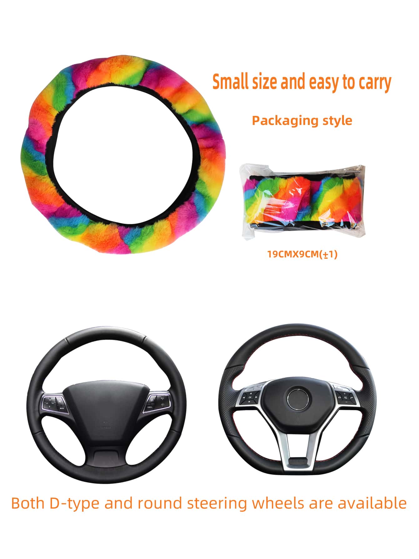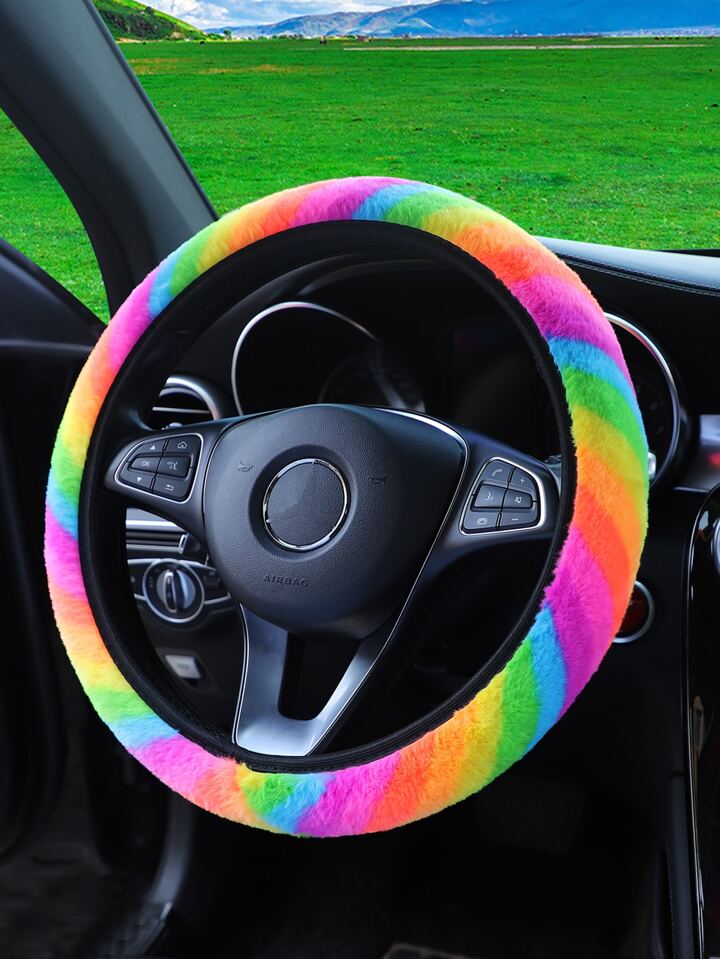 Rainbow Faux Rabbit Hair Steering Wheel Cover