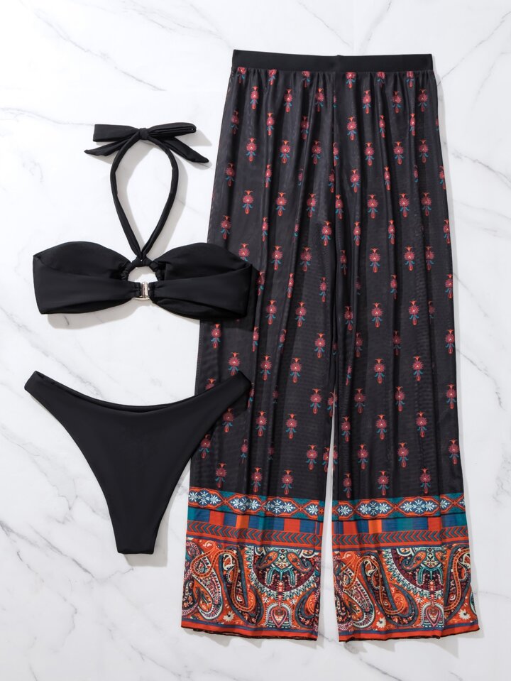 Ring Linked Halter Summer Beach Bikini Set With Cover Up Pants