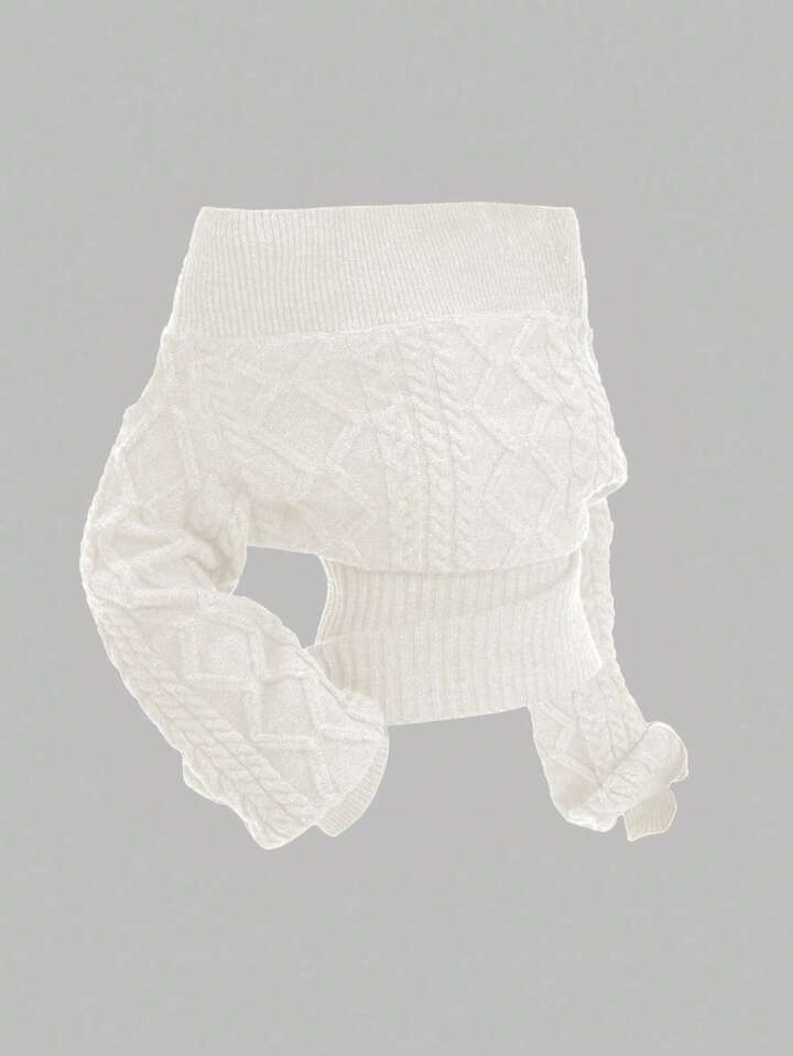 Romantic Thick Knit Z-Pattern Deep Floral Gray Off Shoulder Lantern Sleeve Pullover Sweater