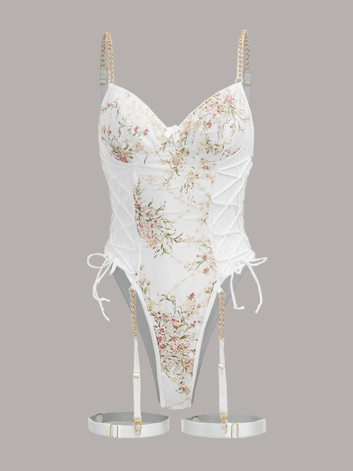 Romwe X Gabiciamp Floral Embroidered Mesh Lace Up Chain Decor Garter Teddy Bodysuit