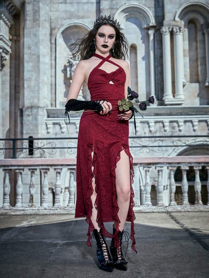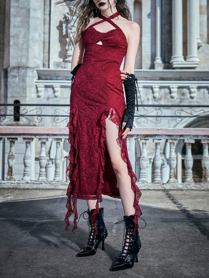 Ruffle Trim Split Thigh Crisscross Halter Neck Lace Dress