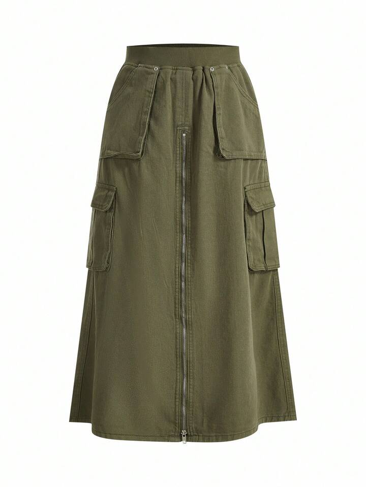 SHEIN x PRISCILA & JIMENA Grunge Punk Flap Pocket Zip Up Denim Skirt, School