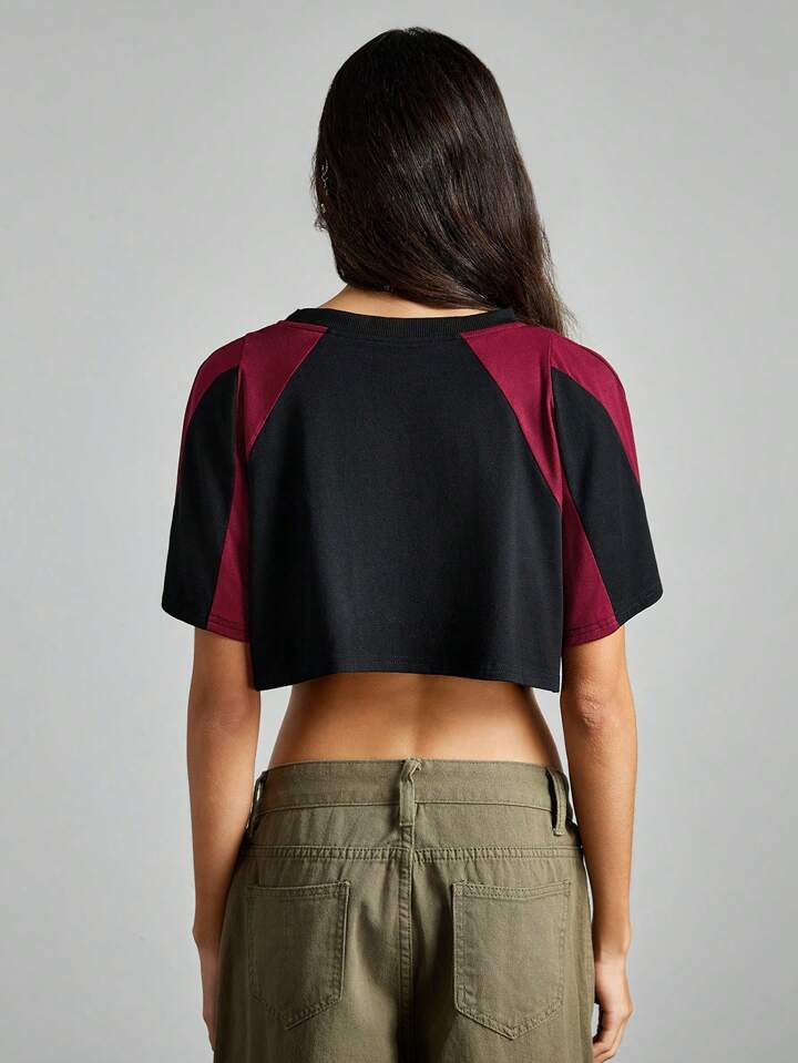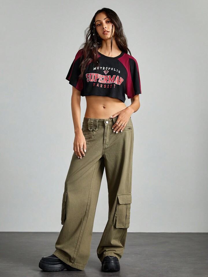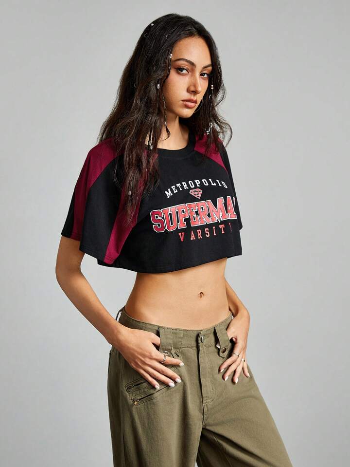 SUPERMAN X ROMWE Casual Loose Color Blocking Letter Logo Print Dolman Sleeve Crop T-Shirt For Women