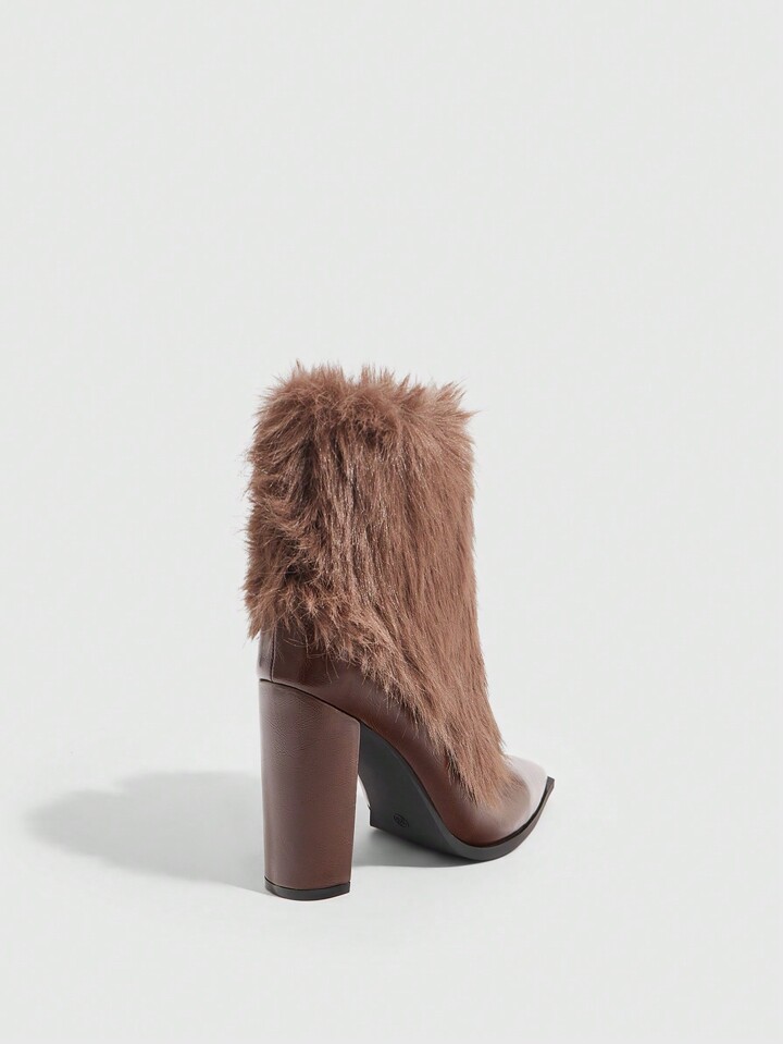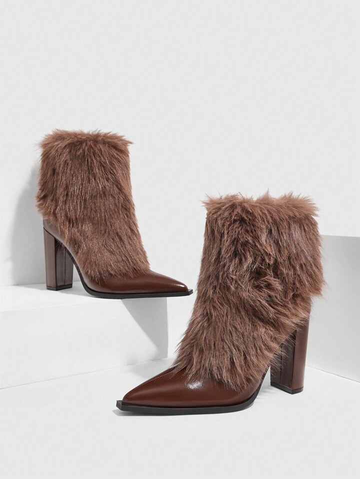 Sexy Fashionable Fluffy Pointed Toe Chunky High Heel Side Zipper Casual Boots, Coffee Color For Women Valentine's Day