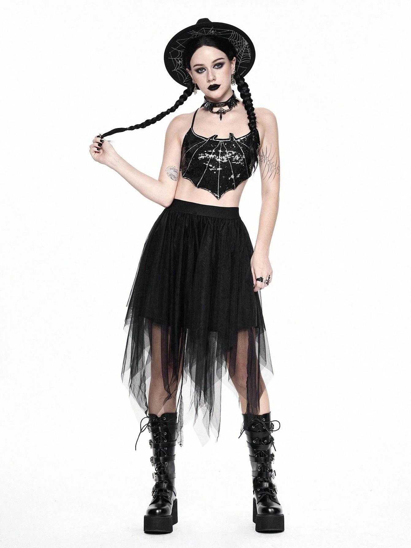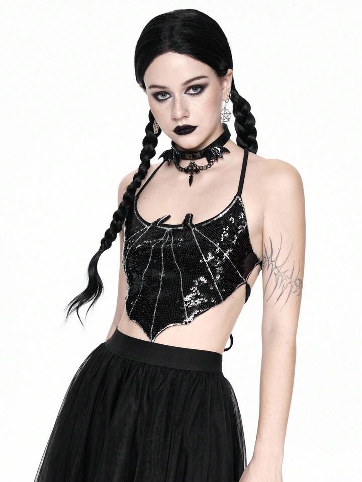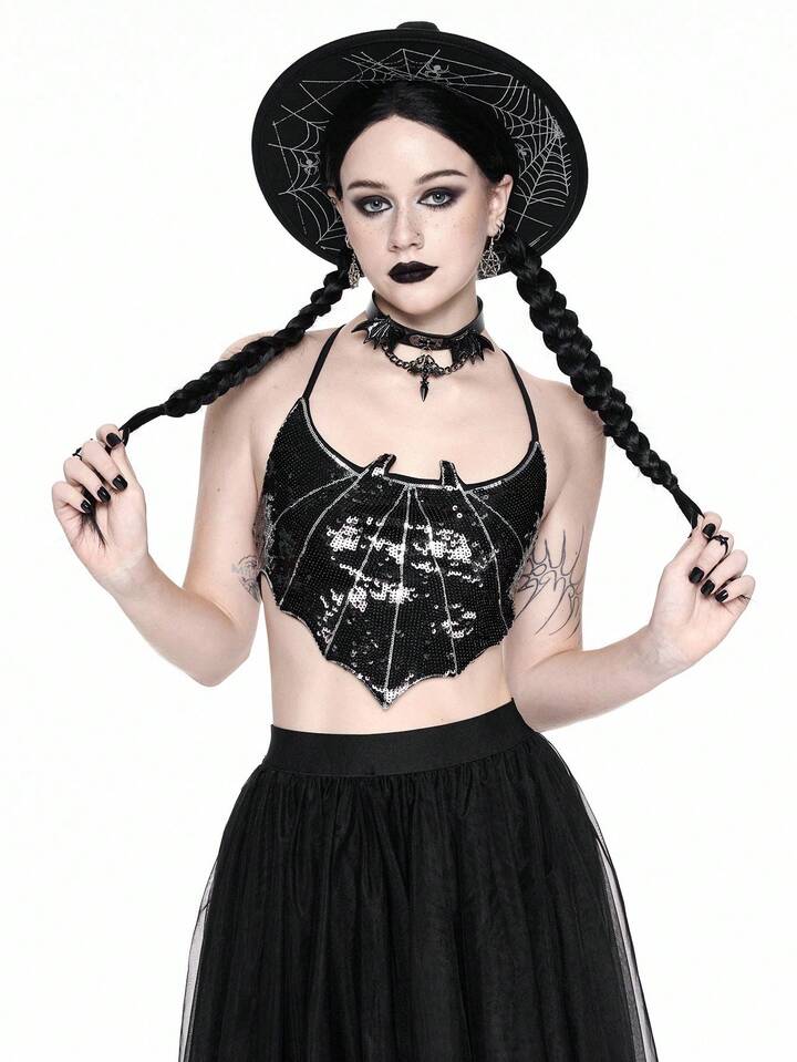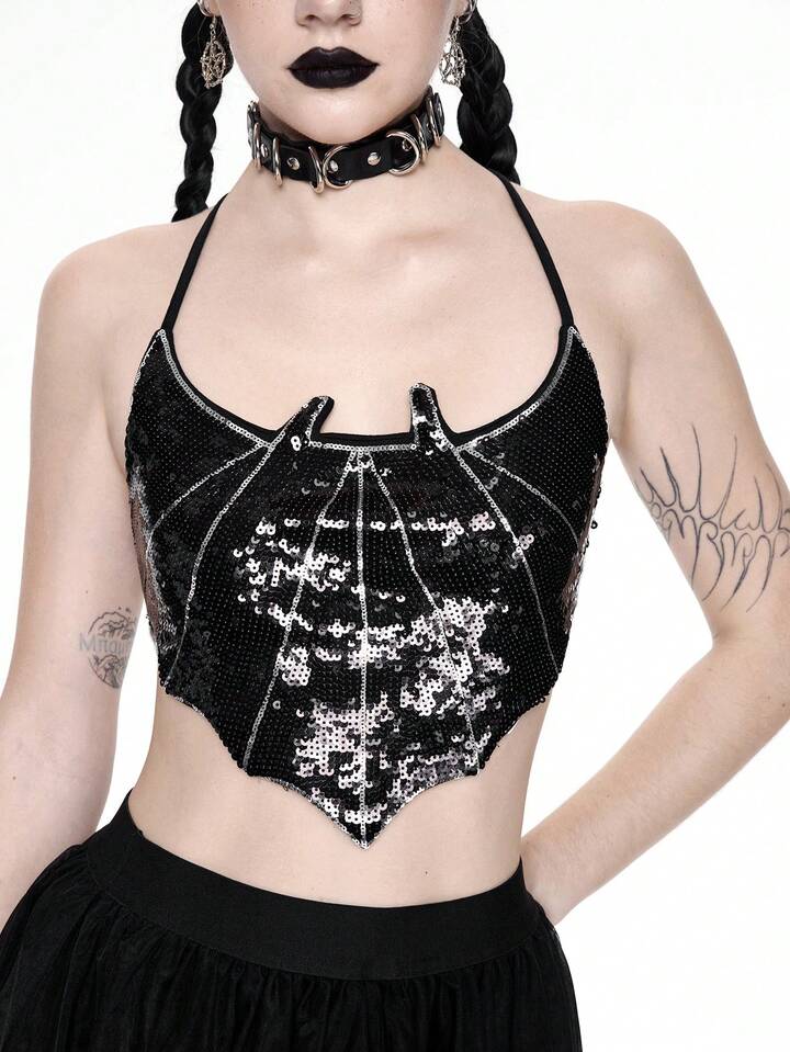 Sexy Gothic Bat Sequin Embroidered Backless Tank Top For Women, Halloween