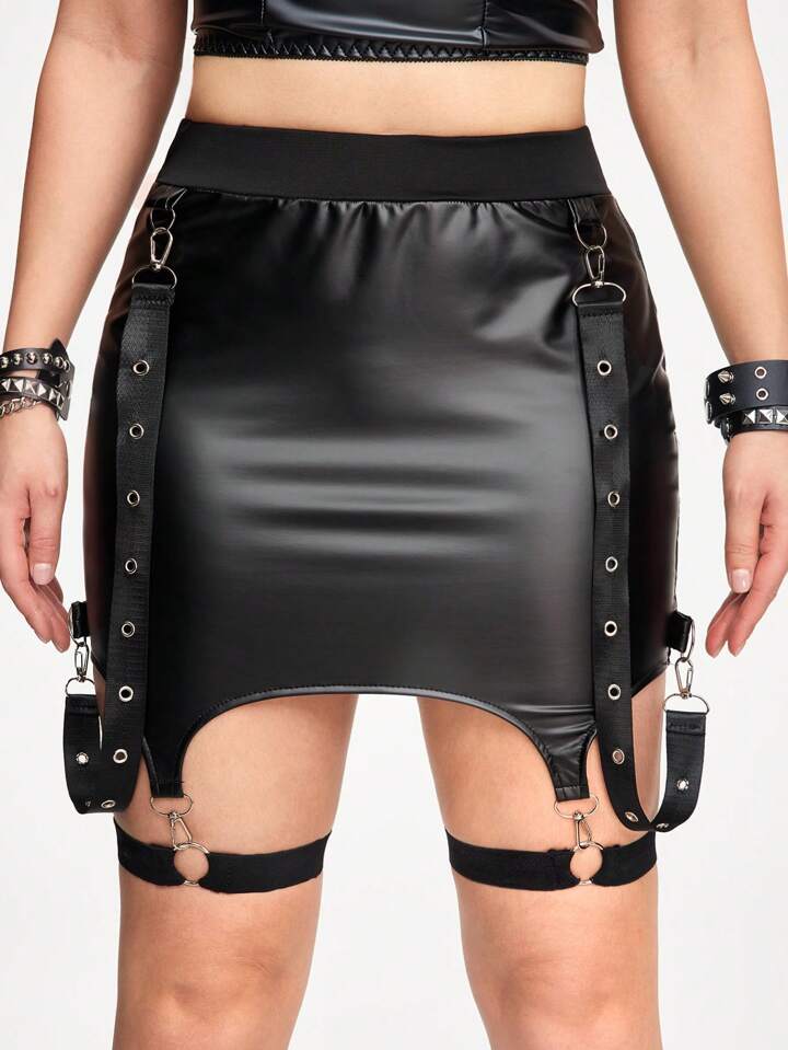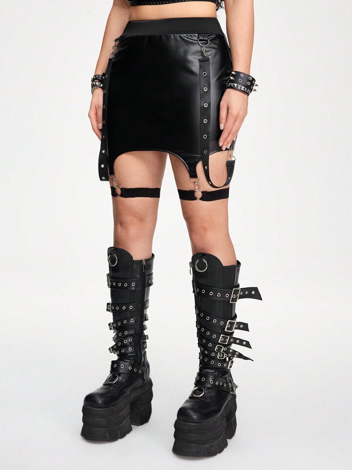 Sexy Gothic Punk Rock Style Black PU Leather Leg Garter Belt With Metal O-Rings And Weave Straps For Women Skirt