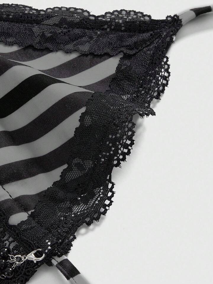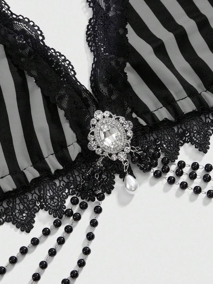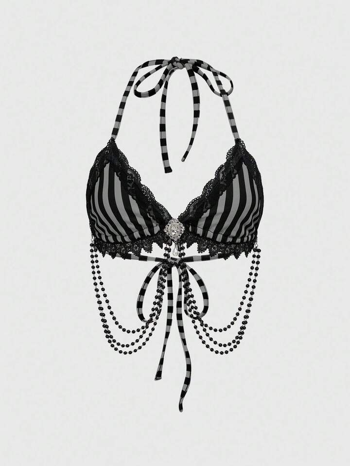 Sexy Women's Gothic Black & White Vertical Striped Crystal Pendant Bikini Top