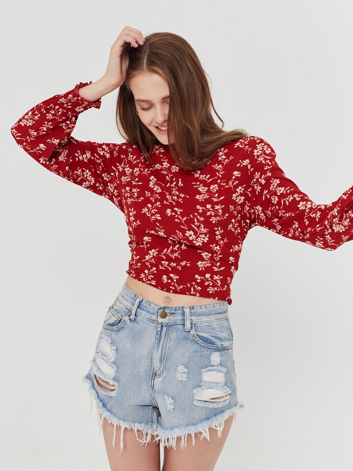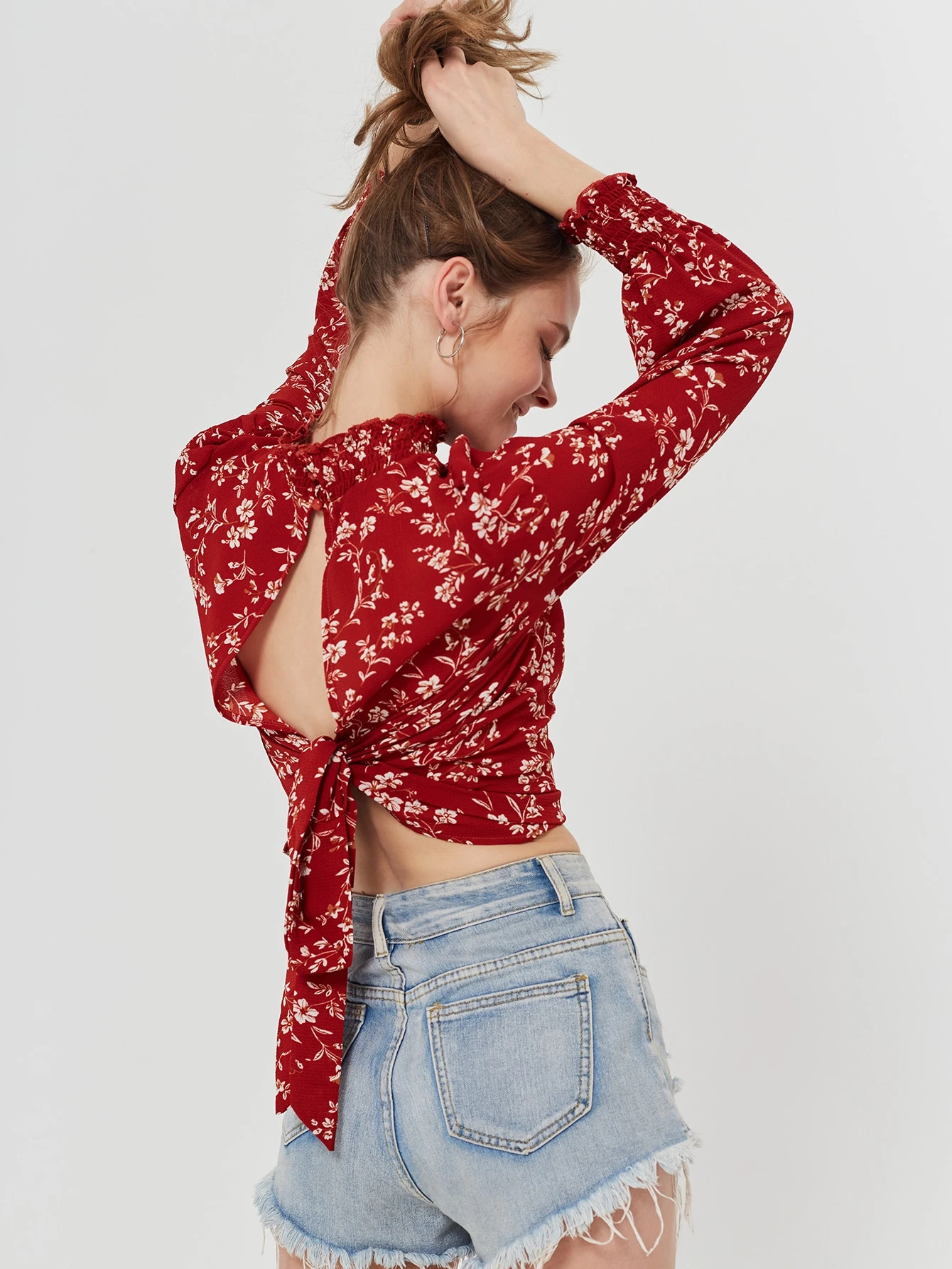 Shirred Neck Tie Backless Ditsy Floral Blouse