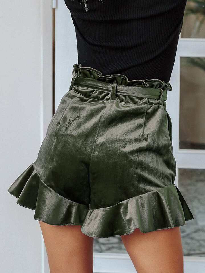 Simplee Flounce Hem Paperbag Waist Belted Velvet Shorts